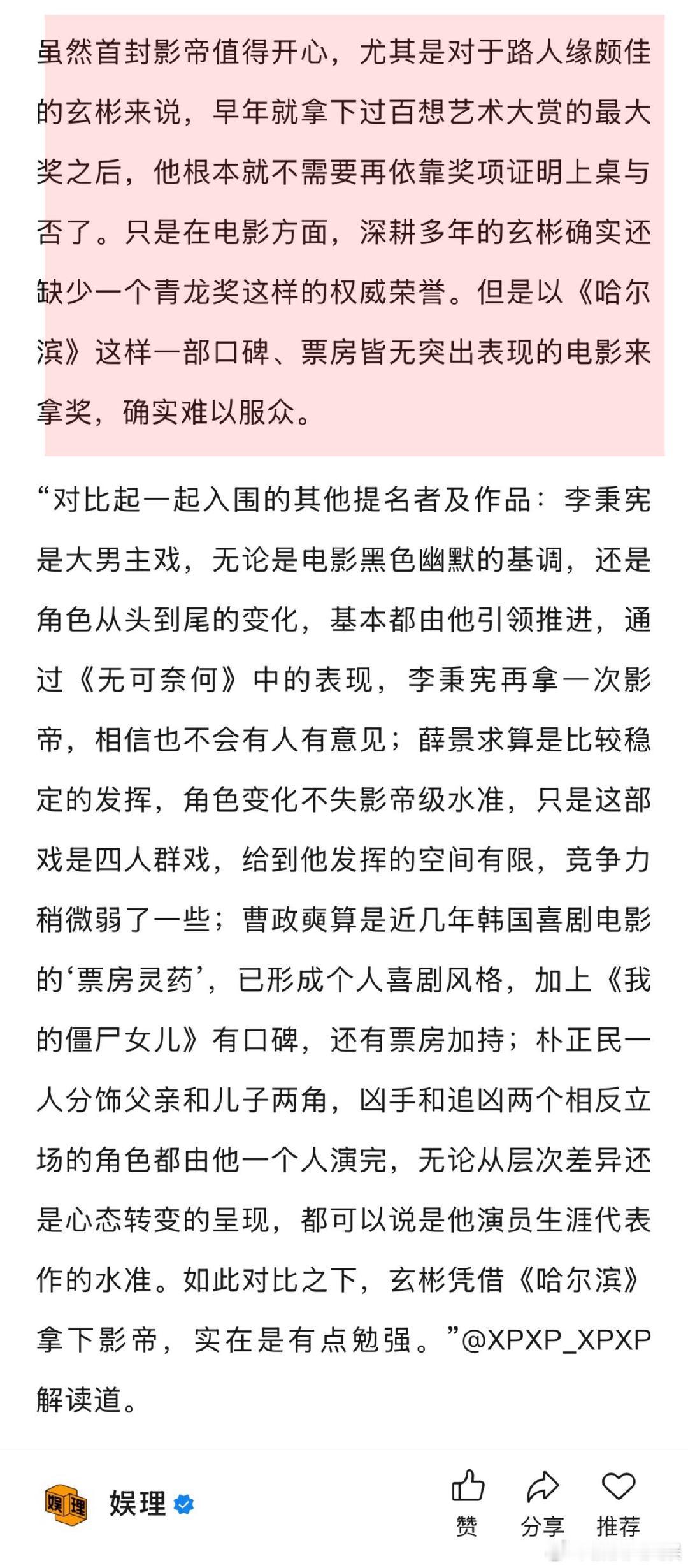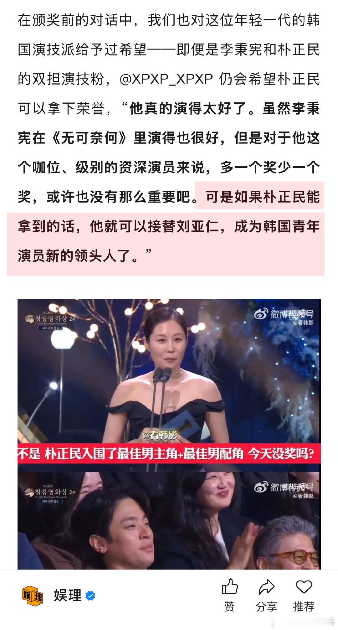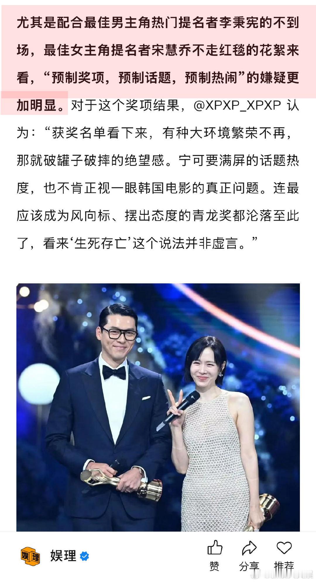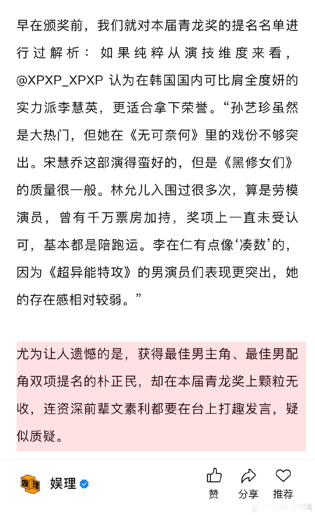 如果纯粹从演技维度来看, 认为在韩国国内可比肩全度妍的实力派李慧英,更适合拿下荣誉。“孙艺珍虽然是大热门,但她在《无可奈何》里的戏份不够突出。宋慧乔这部演得蛮好的,但是《黑修女们》的质量很一般。林允儿入围过很多次,算是劳模演员,曾有千万票房加持,奖项上一直未受认可,基本都是陪跑运。李在仁有点像‘凑数’的,因为《超异能特攻》的男演员们表现更突出,她的存在感相对较弱…”↓