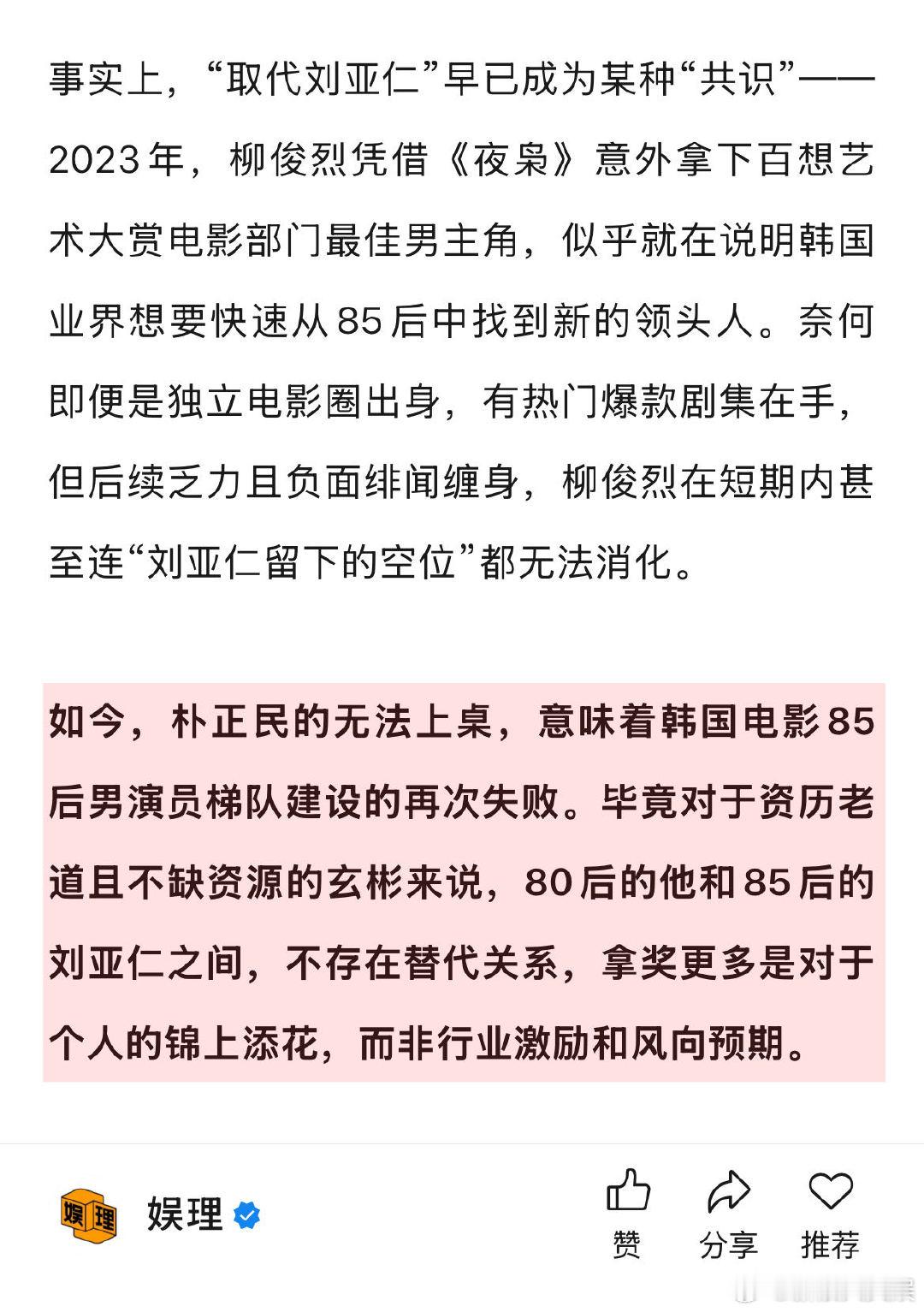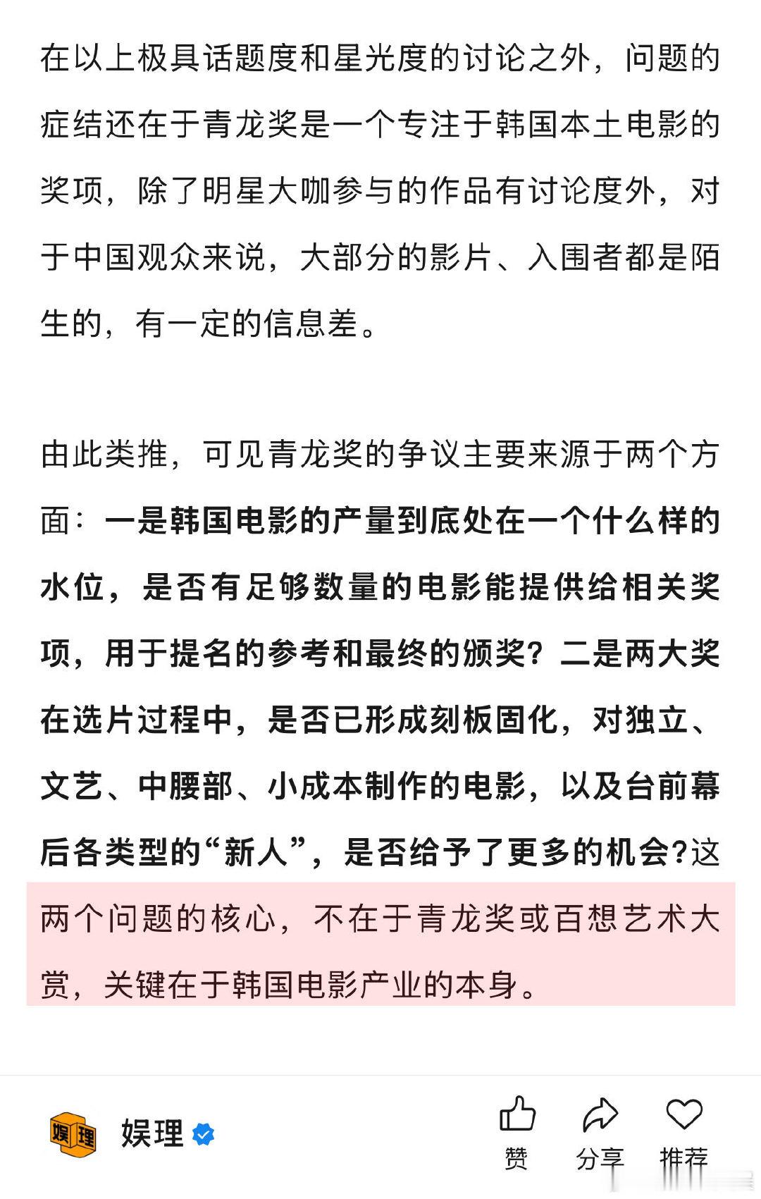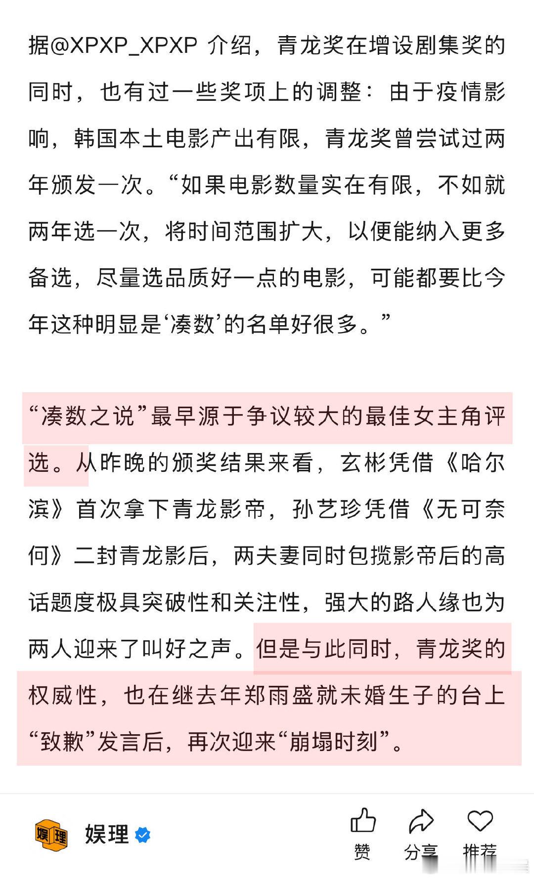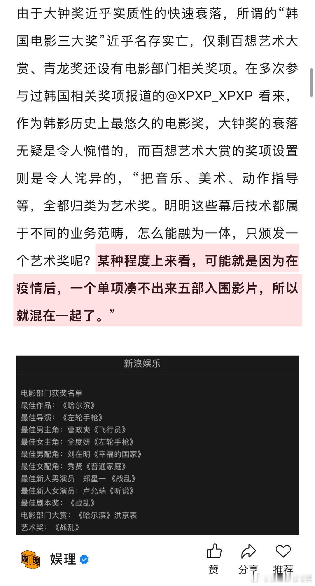 如果纯粹从演技维度来看, 认为在韩国国内可比肩全度妍的实力派李慧英,更适合拿下荣誉。“孙艺珍虽然是大热门,但她在《无可奈何》里的戏份不够突出。宋慧乔这部演得蛮好的,但是《黑修女们》的质量很一般。林允儿入围过很多次,算是劳模演员,曾有千万票房加持,奖项上一直未受认可,基本都是陪跑运。李在仁有点像‘凑数’的,因为《超异能特攻》的男演员们表现更突出,她的存在感相对较弱…”↓