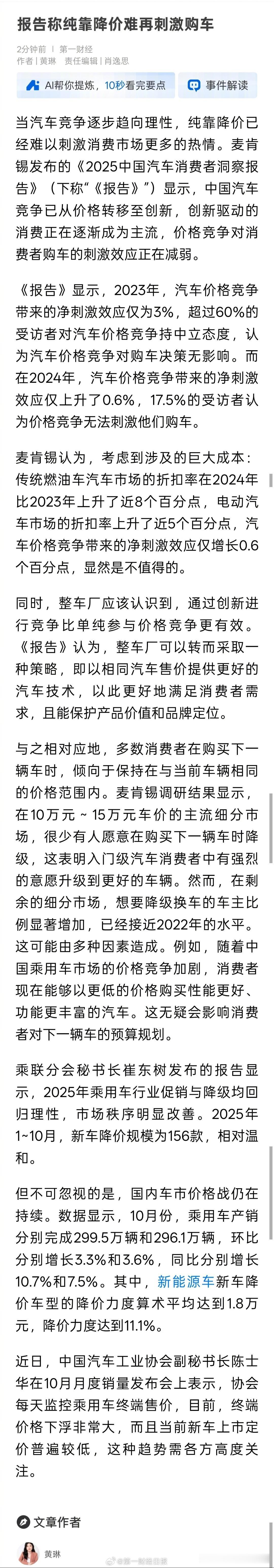 买车不看低价了!报告戳破车企内卷真相,创新才是王炸🔥 汽车圈价格战失灵了!麦肯锡报告显示,纯靠降价难刺激购车,2024年价格竞争净刺激效应仅3.6%,17.5%消费者直言降价没用,超60%人对价格战无感。 中汽协也预警,当前新车定价普遍偏低,终端价格下浮剧烈需警惕。如今消费者买车早已不盯低价,驾驶感受、舒适性、智能化配置成核心诉求,性价比也升级为长期使用成本+品质的综合考量。 从价格内卷到价值竞争,车企拼降价不如拼技术!智能驾驶、快充技术、座舱体验才是吸客关键,你买车更看重价格还是创新配置?报告称纯靠降价难再刺激购车