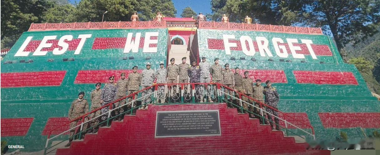 【藏南军情】 11月18日,来自印度高级防务管理研修班( Higher Defence Management Course)的16人代表团窜访藏南瓦弄,其主要目的是为深入了解高海拔和偏远边境地区的作战态势,16人来自印度陆军、海军和空军的高级军官。“考察”期间,官兵们详细了解了当地的安全形势、地形作战挑战以及东部喜马拉雅地区综合后勤保障的重要性。 下图中后面有英语“LEST WE FORGET”,猛地一看以为是他们拼错了,查了查资料,应翻译为“免得我们忘记,多用于提醒人们不要忘记过去的重要事件或经历的短语,尤其是在纪念战争时使用”,这面墙是印度“瓦弄战争纪念馆”的背景,看来印度一直念念不忘1962年的失利。中印冲突 印军演习 印度军事扩张