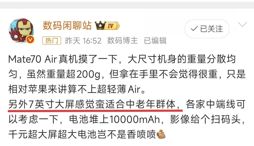 华为Mate70Air开售华为Mate70Air今天开售,起售价4199元,处理器分麒麟9020A和麒麟9020B两个版本,之前有数码大V说,7英寸大屏蛮适合中老年群体,另外这两个版本处理器相当于高通骁龙什么水平?