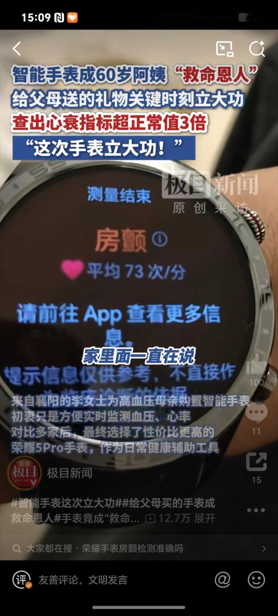 我自己用的就是荣耀手表!心率过低、压力过高都会及时提醒……要是大伙家中有老人,真的可以给准备一个……小小的手表,有时能成为救命稻草
