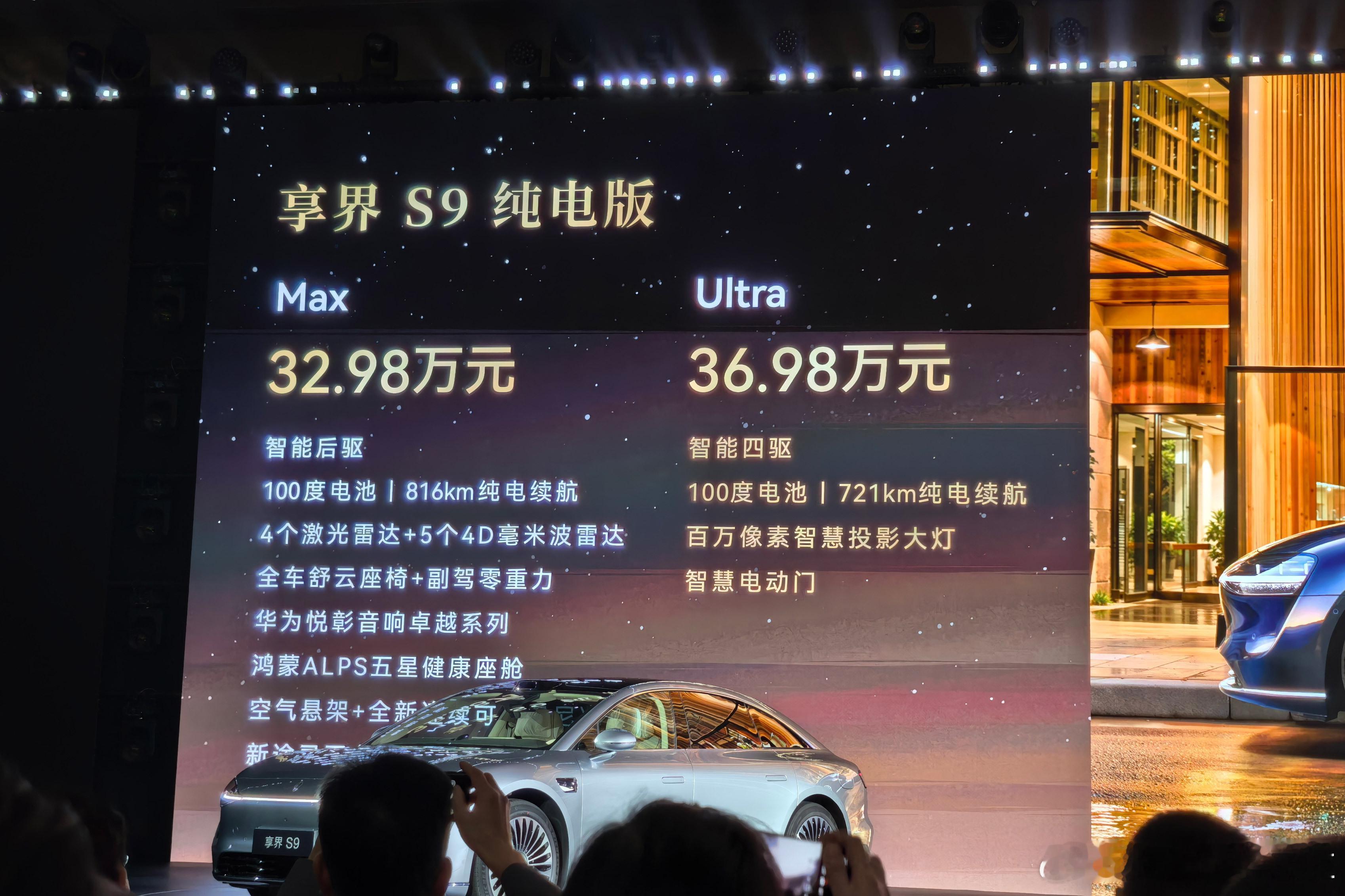 享界 S9 正式上市,此前的预售价为 31.98 万元起,这次正式售价是 30.98 万-36.98 万元。做为鸿蒙智行今年的压轴产品,这一次改款享界 S9 整体变化其实就是和享界 S9T 靠齐。外观方面采用了全新的配色、新的轮毂样式、新的星云尾灯、车外麦克风。同时,内饰也是 S9T 同款内饰,有了副驾娱乐屏、扶手冰箱、全新投影系统、副驾零重力座椅等等。辅助驾驶方面,这一次享界 S9 也是升级为了最新的 ADS 4 软件系统,辅助驾驶硬件也是最新的了。底盘方面,采用全新一代途灵平台,全系标配空气悬架,同时对连续可变阻尼减震器进行了升级。动力方面,依然是纯电+增程两种动力形式都有。纯电版搭载的是华为巨鲸电池平台100kWh 三元锂电800V,CLTC 纯电续航分别是 816km 和 721km,长途出行我觉得也很够了。增程版搭载的 37kWh 电池和 53.4kWh 电池,纯电续航分别是 260km 和 372km,如果想买入门版但觉得 37kWh 电池不够用,也可以话两万选装 53.4kWh 电池。