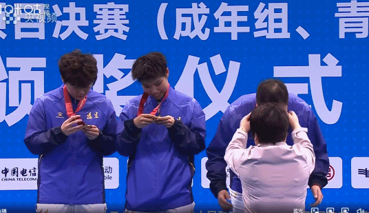 黄东萍和谭宁一边仔细端详获得的金牌,一边感叹~