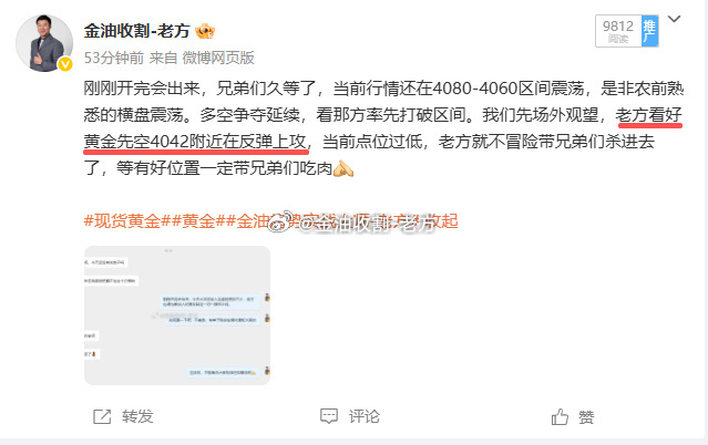 既然多头做不到,那就重开空军路4057位置进空,止盈4040,止损4063