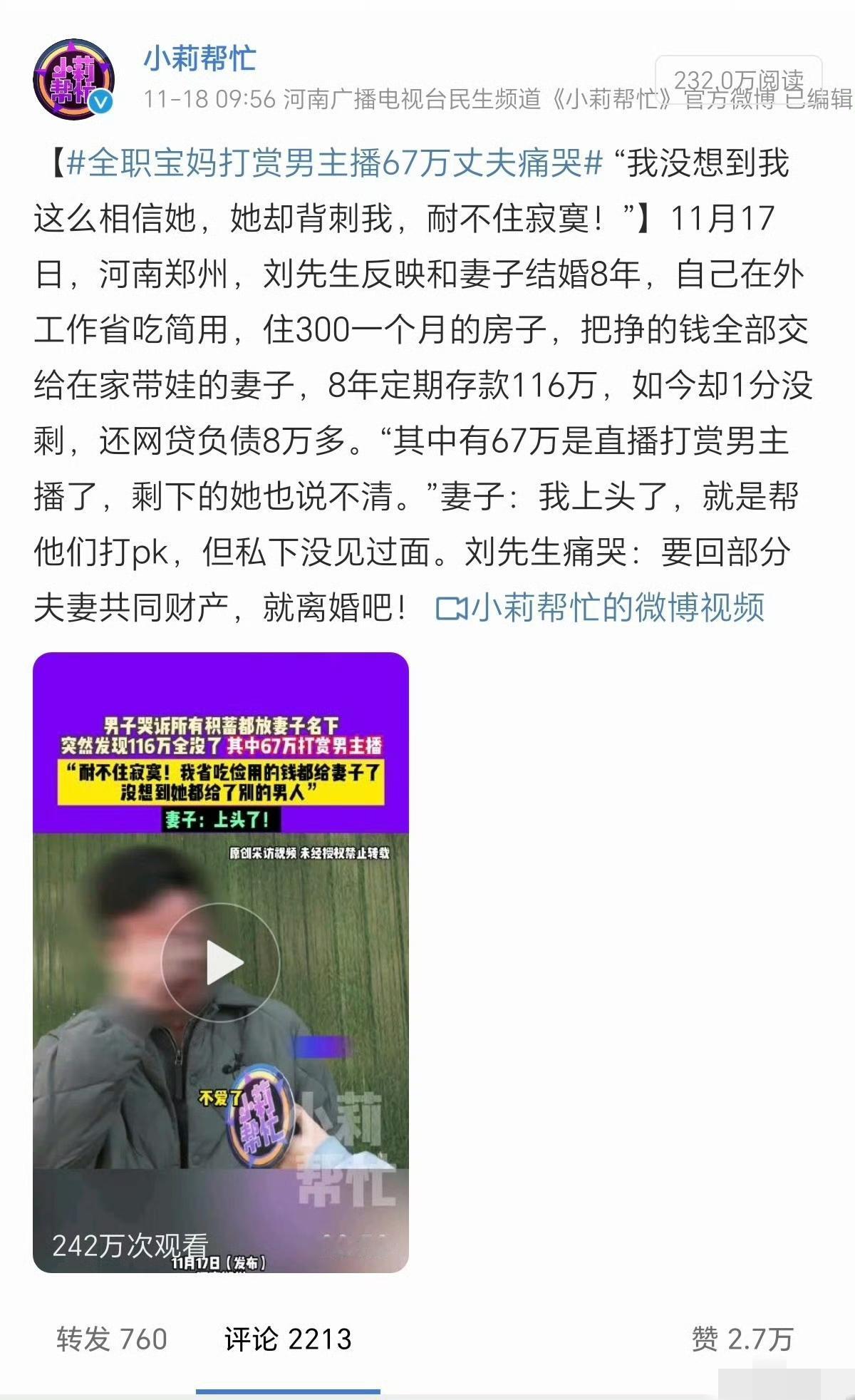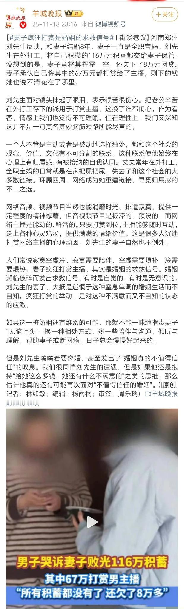 妻子疯狂打赏是婚姻的求救信号,什么狗屁主题,不可思议。[捂脸] 妻子疯狂打赏男主播,居然是婚姻的求救信号吗? 但我寻思着,她给男主播打赏的时候,也没告诉她在外面搬砖挣钱的老公啊。 是不是在羊城晚报看来,男的对外得挣钱养家,对内得提供情绪价值,不然,妻子的所有背叛,都情有可原? [酷拽][酷拽][酷拽]主播打赏 直播打赏主播 主播打赏收入
