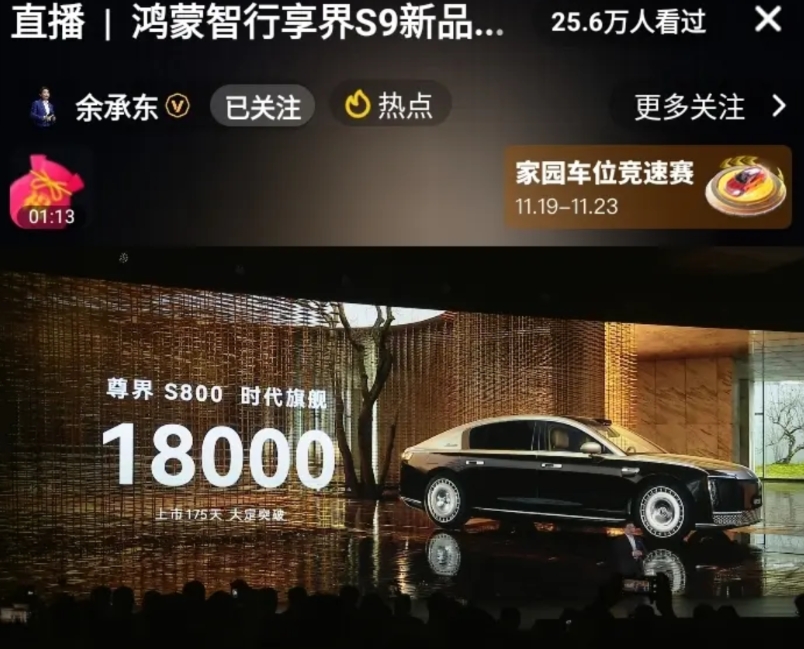 余承东一说起尊界S800的销量来好自豪啊!11月20日下午,在享界新改款S9发布会开场,余总骄傲地说道:“尊界S800上市175天大定突破1万8千台,近两个月每月交付2千台左右,11月份交付将接近3千台,12月份交付将达到3千~4千台!它现在在国内市场是最受高收入群体喜欢和推荐的百万级豪车,销量占百万级豪车的50%左右!”
