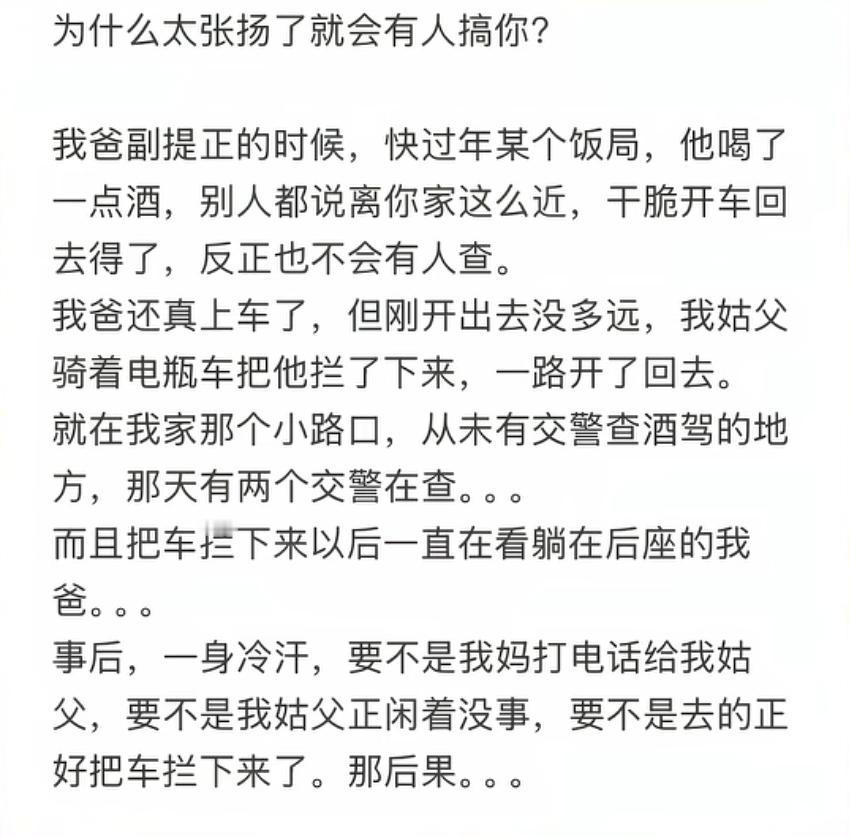 做人还是要低调一点,太张扬了就会有人搞你 老爸副提正的时候,快过年的时候有个饭局,他喝了点酒,别人都说你家离这么近,干脆开车回去得了,反正也不会有人查。结果真开了车,但刚开没多久,姑父骑着电瓶车把他拦下来了,给开了回去。就在我家路口,从没有交警查酒驾,那天有两个交警在查。把车拦了下来,看到躺在后座的老爸。事后,一身冷汗,要不然我妈打电话给我姑父,要不是姑父闲着没事,要不是去的正好,那要出事的。 说不定,那个饭局,就是别人做的局,专门来整他的。 不要去堵概率,哪怕离家再近,也不要喝了酒开车。
