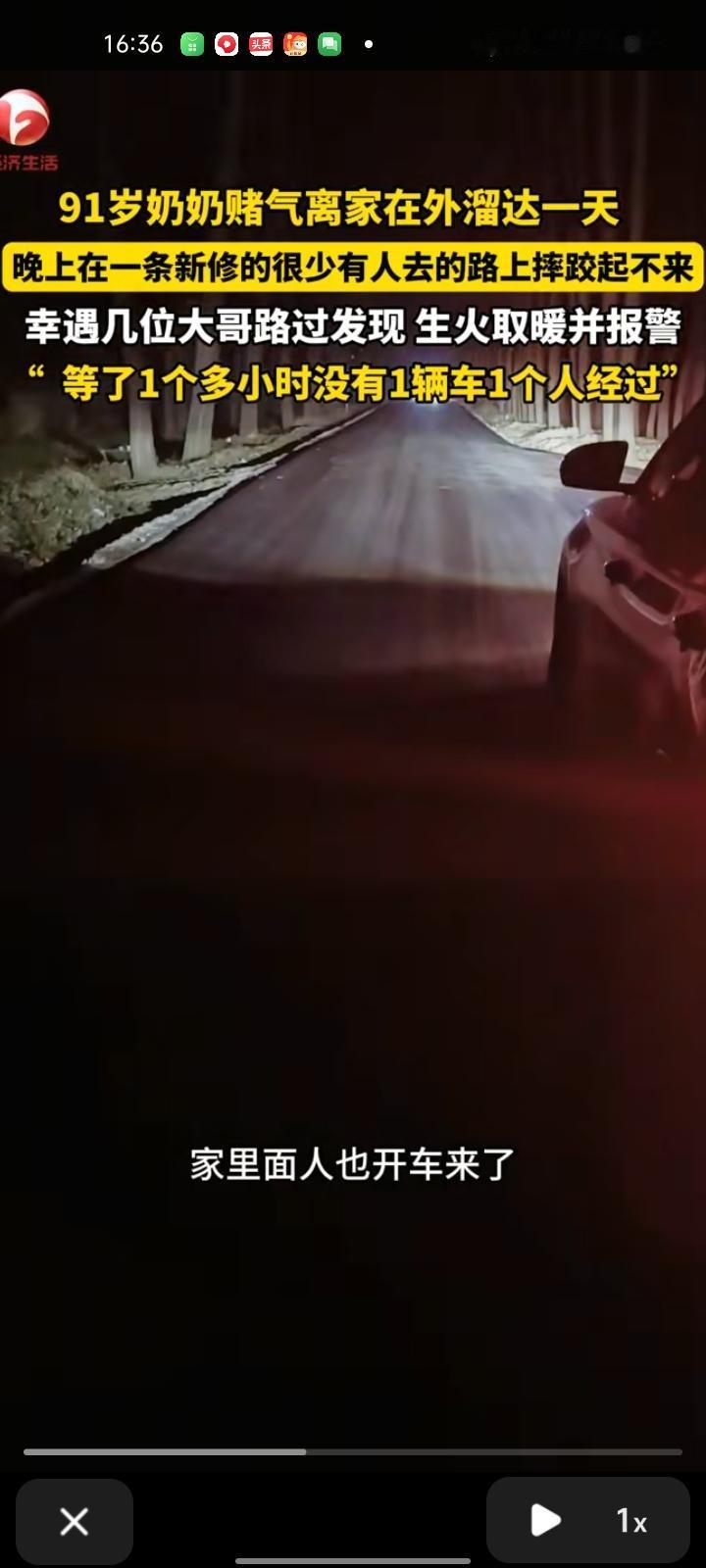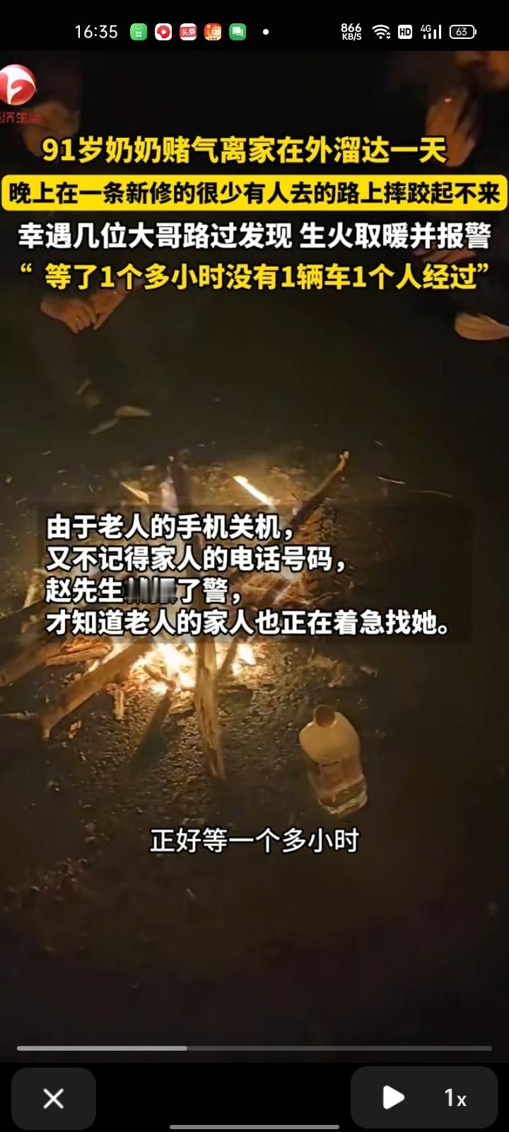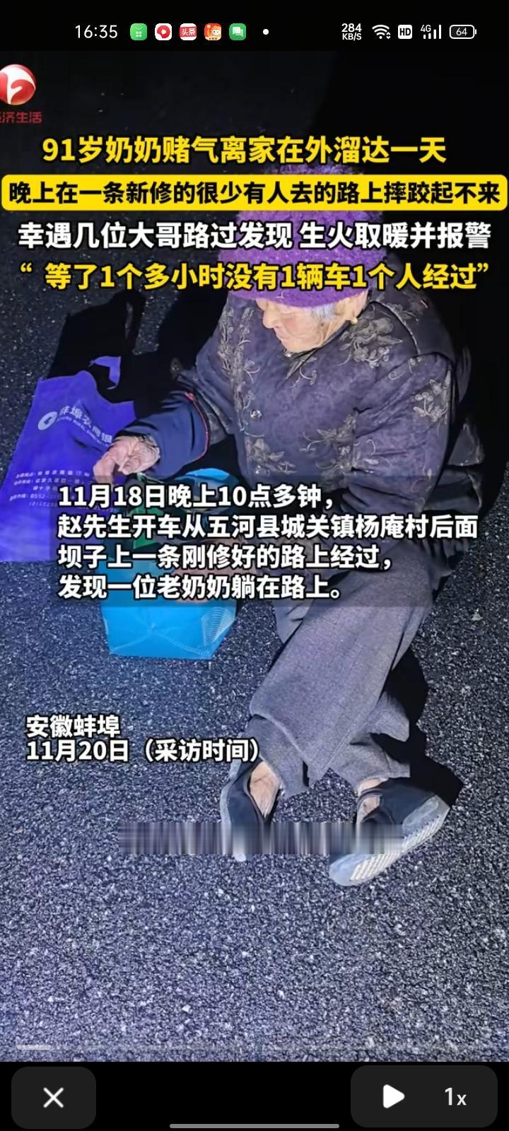 11月18日,蚌埠市五河县。赵先生开车从五河县城关镇杨庵村后面坝子上一条刚修好的路上经过,发现一位老奶奶躺在路上。问后得知,老奶奶赌气吵架离家出走,因为天太黑没有路灯,摔倒起不来了。 由于老奶奶的手机关机,又不记得家人的电话号码,赵先生给她生火取暖并报警,一个小时后,老奶奶的家属开车赶来了,全程没有任何车经过。如果没人发现,老奶奶不知道能撑多久