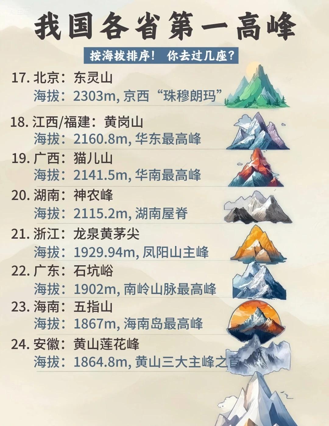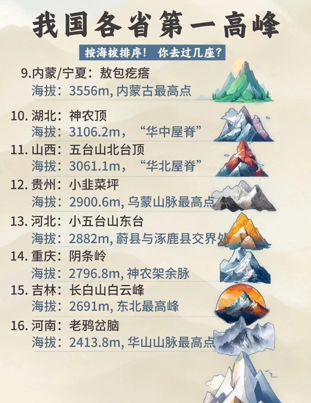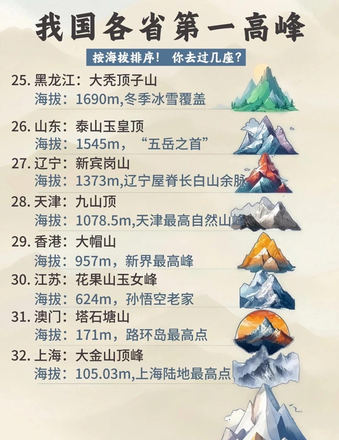 挑战各省第1️⃣高峰!徒步爱好者集合! 盘点我国各省第①高峰,你知道几座? 📍按照海拔排序 · ✅第一梯队Top10 1.西藏:珠穆朗玛峰🏔️海拔:8848.86m 2.新疆:乔戈里峰🏔️海拔:8611m 3.四川:贵嘎山🏔️海拔:7508.94m 4.青海:布喀达坂峰🏔️海拔:6860m 5.云南:卡瓦格博峰🏔️海拔:6740m 6.甘肃:阿尔金山🏔️海拔:5828m 7.台湾:玉山主峰🏔️海拔:3952m 8.陕西:太白山🏔️海拔:3771.2m 9.内蒙/宁夏:敖包疙瘩🏔️海拔:3556m 10. 湖北:神农顶🏔️海拔:3106.2m · ✅第二梯队Top11-20 11.山西:五台山北台顶🏔️海拔:3061.1m 12.贵州:小韭菜坪🏔️海拔:2900.6m 13.河北:小五台山东台🏔️海拔:2882m 14.重庆:阴条岭🏔️海拔:2796.8m 15. 吉林:长白山白云峰🏔️海拔:2691m 16.河南:老鸦岔脑🏔️海拔:2413.8m 17.北京:东灵山🏔️海拔:2303m 18.江西/福建:黄岗山🏔️海拔:2160.8m 19.广西:猫儿山🏔️海拔:2141.5m 20. 湖南:神农峰🏔️海拔:2115.2m · ✅第三梯队Top21-32 21.浙江:龙泉黄茅尖🏔️海拔:1929.94m 22.广东:石坑峪🏔️海拔:1902m 23.海南:五指山🏔️海拔:1867m 24.安徽:黄山莲花峰🏔️海拔:1864.8m 25. 黑龙江:大秃顶子山🏔️海拔:1690m 26.山东:泰山玉皇顶🏔️海拔:1545m 27.辽宁:新宾岗山🏔️海拔:1373m 28.天津:九山顶🏔️海拔:1078.5m 29.香港:大帽山🏔️海拔:957m 30.江苏:花果山玉女峰🏔️海拔:624m 31.澳门:塔石塘山🏔️海拔:171m 32.上海:大金山顶峰🏔️海拔:105.03m · 🧐32个省Z高峰,你去过几座? 🤪快来认领你家乡的Z高峰 · 地理科普 名山不止名山 人文历史趣发现 徒步丈量世界 小众旅行地 想看看你登上最高的山 踏遍名山大川 户外徒步 户外登徒步