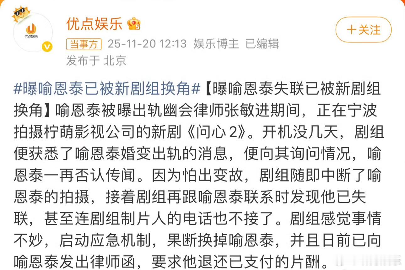 问心2剧组要求喻恩泰退还已支付片酬,剧组因喻恩泰被曝婚变已决定将其换角,等一个回应