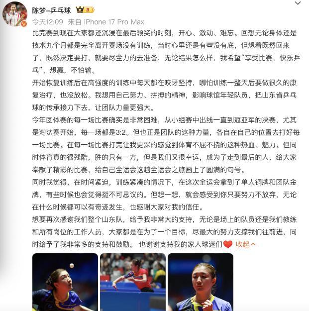 比完赛,写这么长的总结,还真的不多吧。这也可见她的认真程度,正如她在总结中说的一样,就算之前那么时间没有比赛和训练,但既然来了,就好好准备和放手去拼,结果也是美好的。陈梦这一路走来,有太多声音了,但她还是扛了下来。竞技场上,心态也是一门技术,是技术正常发挥的保障,没有一个强大的心态是很难过关的。第十五届全运会也结束了,有太多的精彩,也有太多像陈梦这样拼的体育精神,留给我们也不只是奖牌榜的数量,还有背后的许许多多。
