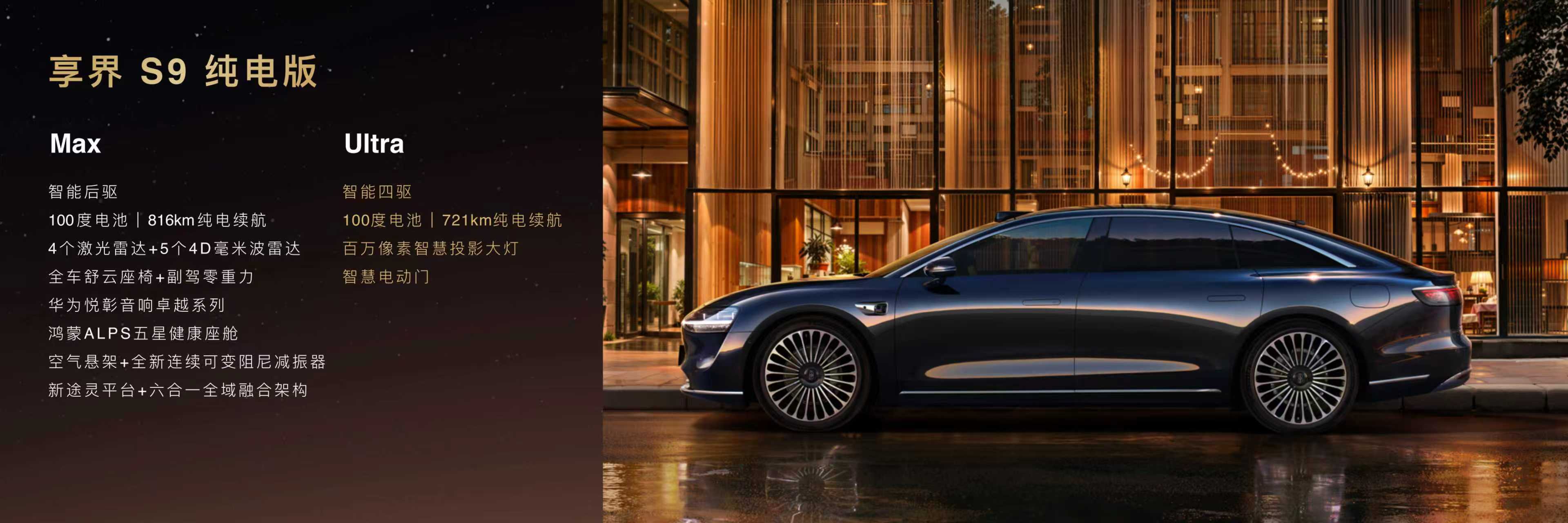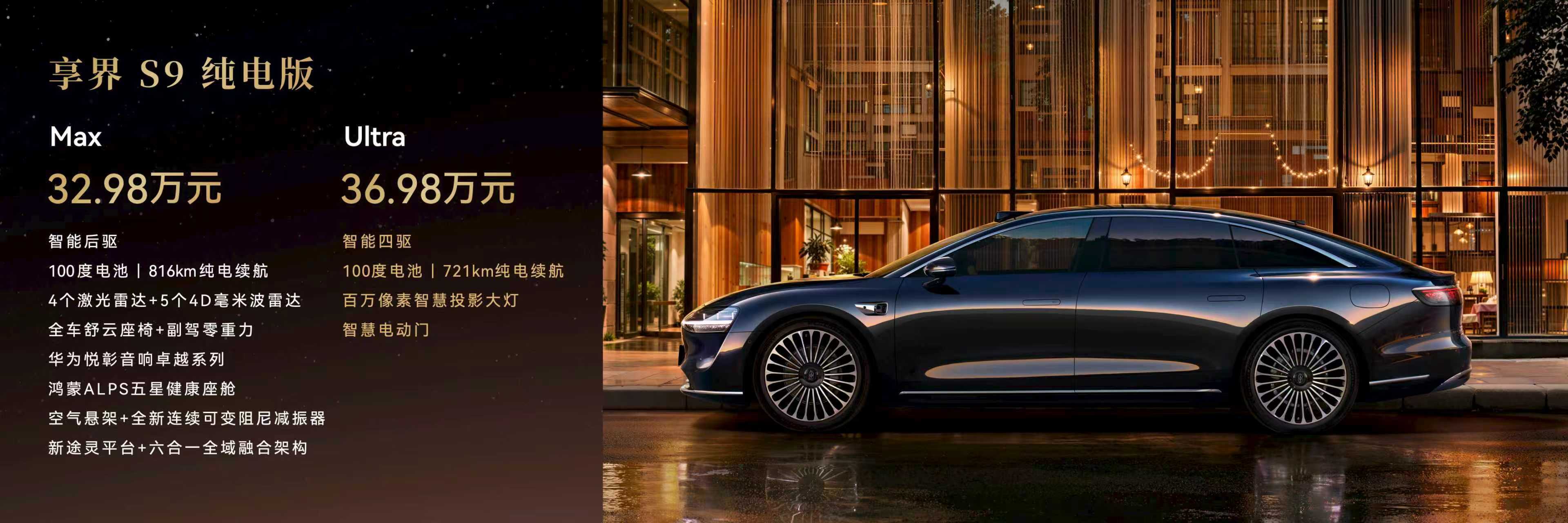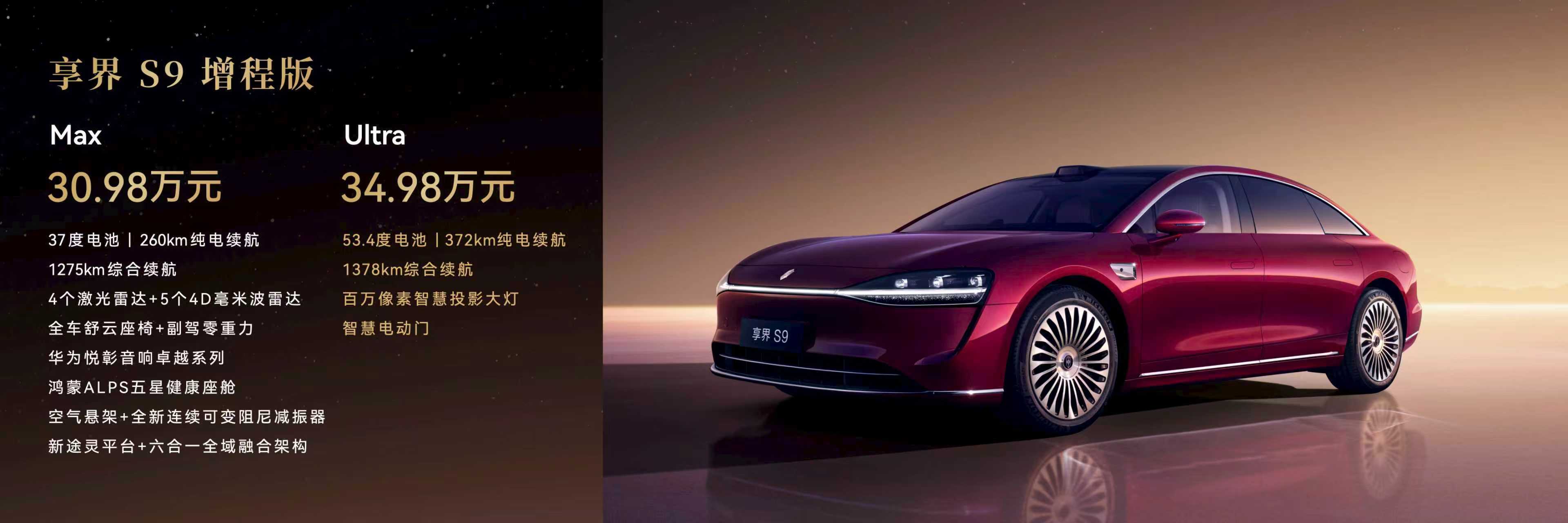 新款享界S9正式上市了~ 30.98万起,增程、纯电两大版本共4款配置,顶配36.98万,然后首销期下定能享受6万权益~核心亮点再提及一下:增程版最长1378km续航,纯电版816km续航+15分钟快充,还有新一代华为途灵平台、华为ADS 4智驾、零重力座椅和32英寸投影巨幕这些舒享配置。 当然我最好奇的还是最后预告的鸿蒙智行旗舰MPV!明年年初估计就能见到了,我猜测还是增程+纯电双动力?可以期待一下!