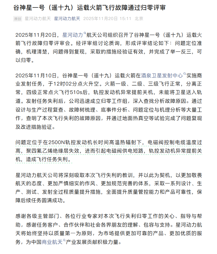 【谷神星一号遥十九运载火箭发射失利原因确认:已通过归零评审】11月20日消息,北