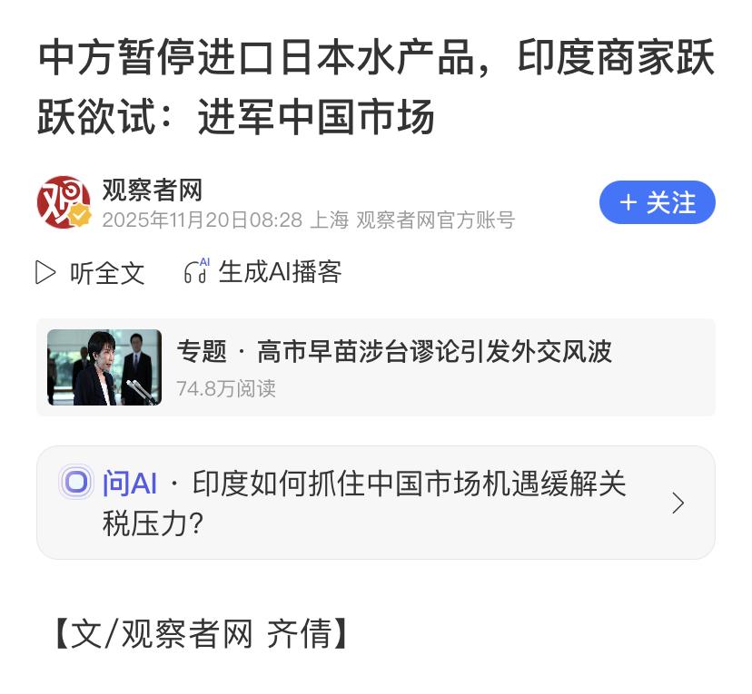 不进口日本海鲜,印度高兴? 提到印度,可能没人会和海鲜联系在一起。但印度海鲜我还真吃过。几年前去新德里时吃过鱼和虾,可能是因为在酒店里吃的,味道挺好,没敢尝试街边的馆子。 不过中国暂停进口日本海鲜,让印度海鲜弥补,恐怕也不靠谱。印度海鲜运到中国的成本比日本更高。而且在普通中国人印象里,印度比较脏乱差,他们海鲜的吸引力恐怕不大。