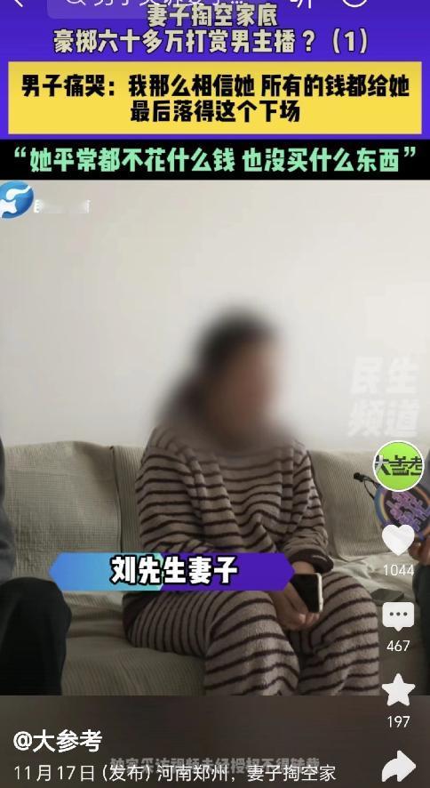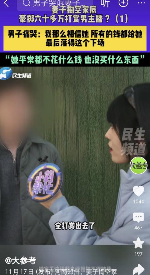天都塌了!河南郑州,一男子结婚8年,省吃俭用存了116万,他交给妻子保管,谁知查账时发现,妻子账上只有3毛钱,男子还发现,不但积蓄没了,妻子还借了80000元网贷,男子这才知道,67万被妻子打赏给了男主播,其余的钱,妻子支支吾吾说不清楚,妻子: 他叫我宝宝,忍不住上头了,男子大哭: 我那么相信她,钱都给了她,却落得这样下场…   刘先生的婚姻看似稳固。他主外,辛苦打拼;妻子主内,全职照顾孩子。   为了给妻子足够的“安全感”,他将整整八年积攒的116万元,全部以定期存款的形式,存在了妻子的名下。   他从未怀疑过,这是他能给家庭的最好保障。   然而,现实给了他最沉重的一击。当他偶然需要用钱,却发现那个象征着家庭未来的数字,已经变成了刺眼的0.3元。   他无法相信自己的眼睛,更无法接受妻子的解释。信任的基石轰然倒塌,随之而来的是无尽的绝望和愤怒。   67万元,这个惊人的数字,流向了一个素未谋面的男主播。   妻子的解释轻描淡写:“他叫我宝宝,我忍不住就上头了。”   她强调,打赏只是为了帮主播在平台PK赛中获胜,两人从未在线下见过面。   但金钱的流逝并未就此打住。除了打赏的67万,其余近49万元的巨款,妻子支支吾吾,根本说不清去向。   更可怕的是,家庭的财务状况不仅被掏空,还背上了8万元的网贷。   这笔债务,极有可能也是为了继续填补那个虚拟世界的无底洞。   刘先生彻底崩溃了。他对着镜头大哭:“我那么相信她,钱都给了她,却落得这样下场…”。   他的哭声,是对妻子背叛的控诉,也是对自己八年付出的悲鸣。   他坦言,对这段婚姻“已经死心”,但肩上还有赡养老人、抚养孩子的重担,他必须先想办法追回钱款,再谈离婚。   这件事绝非孤例,它深刻地反映了当前社会的一些结构性问题。刘先生的悲剧,首先暴露了传统家庭财务管理模式的脆弱性。   他将经济大权完全上交,自以为是信任的体现,却忽视了任何不受监督的权力都可能走向失控。这种“甩手掌柜”式的信任,在现代社会充满了风险。   有专家指出,健康的夫妻财务关系,需要建立在透明和沟通之上。   定期同步财务流水、设定大额支出的协商机制,这些看似破坏“浪漫”的制度设计,恰恰是抵御风险的防火墙。   婚姻中的信任,不能替代必要的制度设计。   更深层次的问题,则直指直播经济背后的情感剥削。   男主播一句轻飘飘的“宝宝”,就能让一个家庭主妇豪掷千金,这绝不是偶然。   这背后是一整套精心设计的商业逻辑,是平台算法与人性弱点的精准合谋。   “PK助力”、“守护榜一”,这些看似游戏化的玩法,本质上是利用粉丝的虚荣心和情感依赖进行变现。   主播们通过标准化的温柔话术,为那些在现实生活中感到孤独、缺乏价值感的人,提供了一种廉价的情感慰藉。   这种慰藉,最终需要用真金白银来支付,其成瘾性堪比数字鸦片。   我们还必须看到,刘先生妻子作为全职主妇的困境。   长达八年的居家生活,让她逐渐脱离社会,社交圈萎缩,自我价值感被不断削弱。   当现实世界无法提供足够的情感支持和身份认同时,她便极易在虚拟世界中寻求替代品。   男主播的关注,成了她证明自身价值的唯一途径。   因此,简单地将责任归咎于妻子“拜金”或“愚蠢”,是极其片面的。   她的行为,是个人心理需求缺口与直播平台商业套路碰撞下的必然产物。   社会在呼吁家庭责任的同时,也应关注居家群体的心理健康与社会支持体系的建设。   值得庆幸的是,法律和监管层面已经开始行动。   根据《民法典》第1066条的规定,婚姻关系存续期间,一方擅自挥霍夫妻共同财产且严重损害共同利益的,另一方可以请求分割财产。   而最高法的司法解释,已明确将“单方打赏明显超出家庭消费水平”的行为纳入“挥霍”的认定范畴。   刘先生的案例中,妻子作为无收入方,打赏金额占总积蓄的58%,远超正常家庭的消费水平,完全符合法律要件。   参考2025年辽宁大连的一起类似判例,当时法院成功调解,让主播返还了部分打赏款。   这为刘先生通过法律途径追回损失提供了一线希望。   同时,国家层面的监管也在收紧。   自2025年以来,网信办等多部门已开展专项整治行动,剑指“非理性打赏”乱象,要求平台建立“打赏冷静期”和额度限制。   就在本月,最高人民法院也透露,正在调研相关案例,拟出台新的指导意见,进一步细化“严重损害财产利益”的认定标准。   刘先生的遭遇,是一个时代的警钟。   它告诉我们,在数字浪潮席卷一切的今天,旧有的家庭伦理和信任模式正面临前所未有的挑战。   当虚拟世界的情感慰藉变得触手可及时,现实生活中的情感连接就显得愈发珍贵和脆弱。