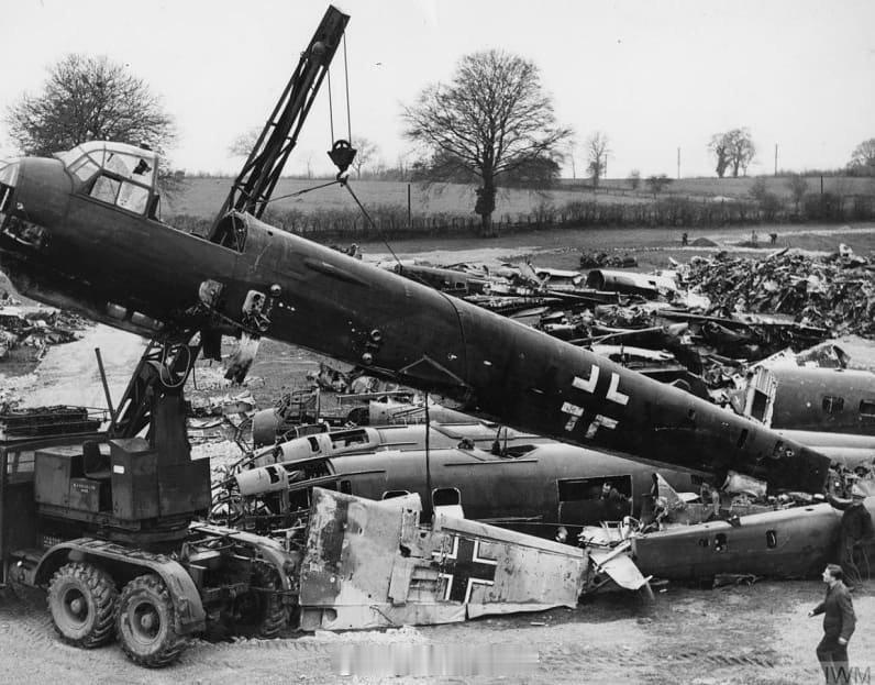 回收贵重有色金属——英国政府将击落的德国飞机残骸(轰炸机He-111、Ju-88及战斗机Me-109)送往熔炼厂。1942年2月。