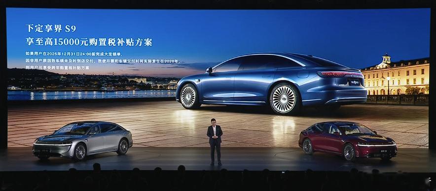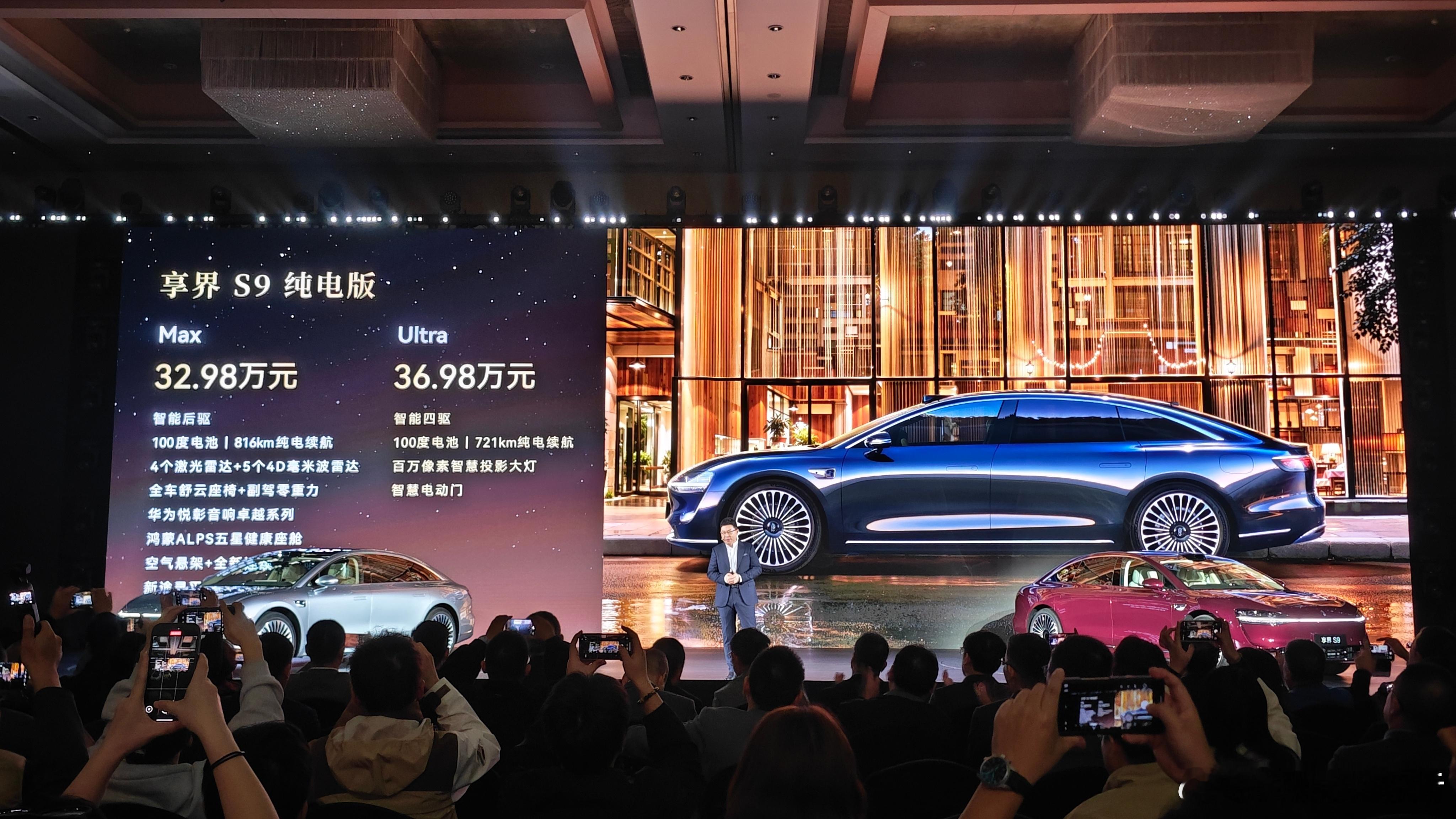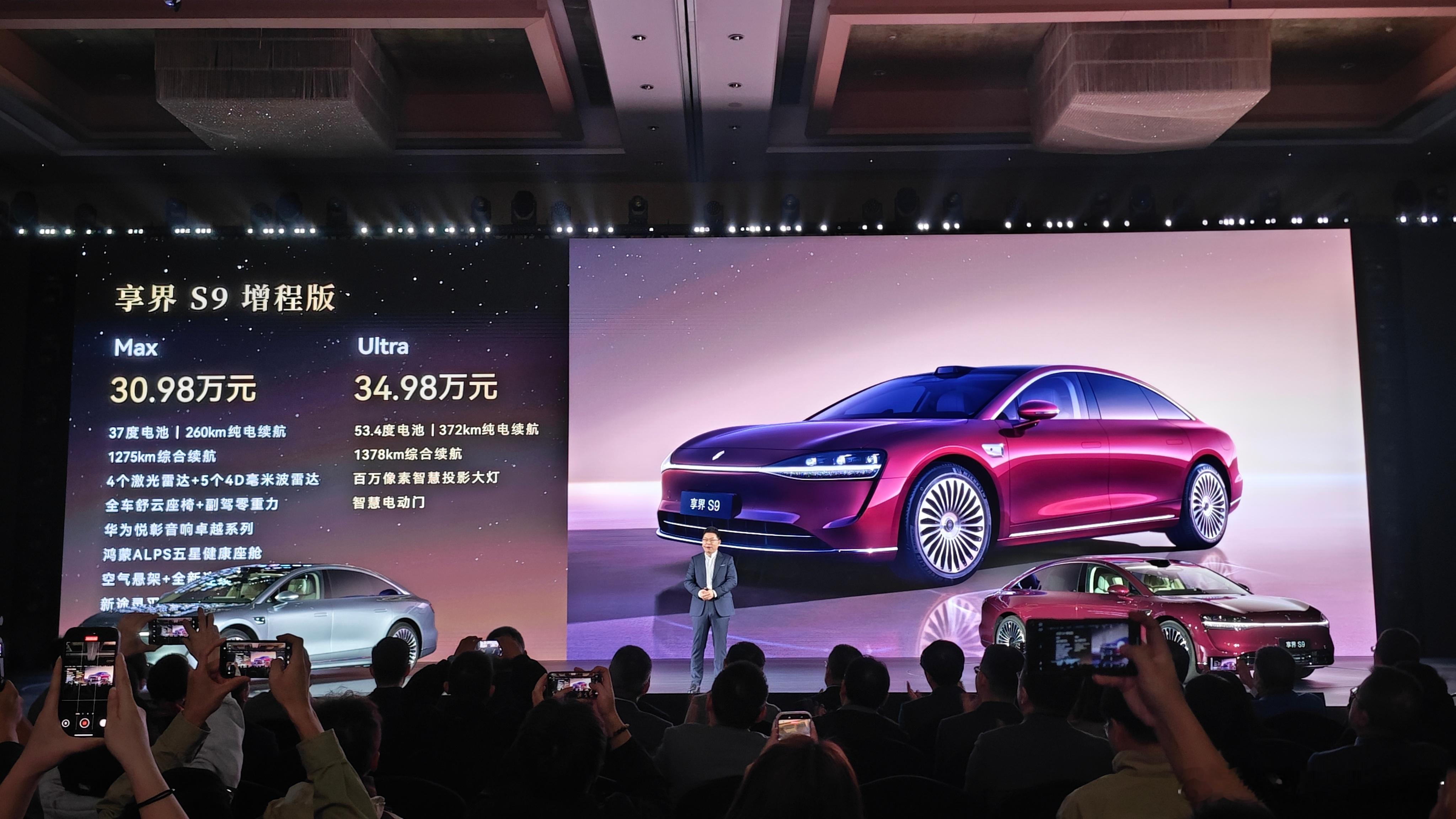 11月20日,鸿蒙智行享界S9上市,涵盖增程和纯电两种动力,共推出4款车型,售价区间30.98-36.98万元。新车换装寰宇之星车标、璀璨星河大灯与星云贯穿式尾灯,提供6种车身配色及曜黑套件,定位中大型行政轿车,长宽高3050×2005×1492mm,轴距5160mm,风阻0.193。内饰方面,配备12.3英寸仪表、16.1英寸中控屏、12.3英寸副驾屏,Nappa真皮+实木饰板,全系标配车载冰箱、四座通风加热按摩、舒云座椅、副驾零重力座椅及7处快充接口。纯电版前备箱38L,后备箱下方48L暗格。底盘升级途灵平台,前双叉臂+后五连杆,标配连续可变阻尼减振器与5档可调空气悬架,采用尊界同源六合一全域融合架构,麋鹿测试84.1km/h,百公里刹停32.32米。安全方面,六横八纵车身、9气囊、7重冗余,通过110km/h副驾偏置碰+80km/h追尾挑战,搭载4颗激光雷达、3分布式4D毫米波雷达,支持全维防碰撞4.0,前向AEB工作至150km/h。动力方面,S9增程版搭载华为雪鸮智能增程系统,全系后驱,配备37kWh和53.4kWh电池组,纯电续航260km和370km,CLTC综合续航里程超过1300公里,亏电百公里油耗仅5.85升。纯电版基于800V高压平台打造,提供后驱和四驱两种版本,标配宁德时代100度三元锂电池,CLTC工况续航816km和721km。