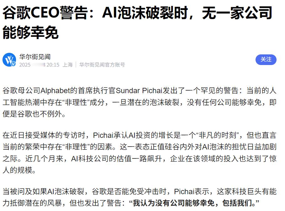 硅谷大佬已经不止一个发表AI泡沫的言论,这代表顶层精神对AI的发展已经产生分歧。从认知扩散的角度来讲,还需要一段时间的酝酿,才能触发“大模型完了”的悲剧时刻。谷歌我认为抗风险能力极强,受影响较小。英伟达就未必了,一家只卖铲子的B端公司,其实到现在的市值是非常扭曲的。且护城河并不深,因为只有铲子没有形成业务闭环。从这一点上来说,谷歌要比英伟达值得投资。谷歌是一个业务全闭环公司,生态非常完整,也是将来AI业务发展前景最好的。