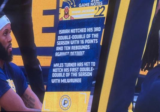 NBA常规赛继续进行,步行者今天在主场127-118战胜黄蜂。美媒Fullcourtpass晒出一张图片,步行者今天主场大屏幕打出的数据疑似讽刺迈尔斯·特纳:以赛亚·杰克逊在对阵活塞砍16分10篮板后拿到了本赛季的第3次两双,然而特纳本赛季在雄鹿还没拿到过两双。根据NBA官方数据,特纳本赛季在雄鹿单场最高分是23分,单场最多的篮板是8个,单场最多助攻是5次,单场最多抢断是4次,单场最多盖帽是5次。