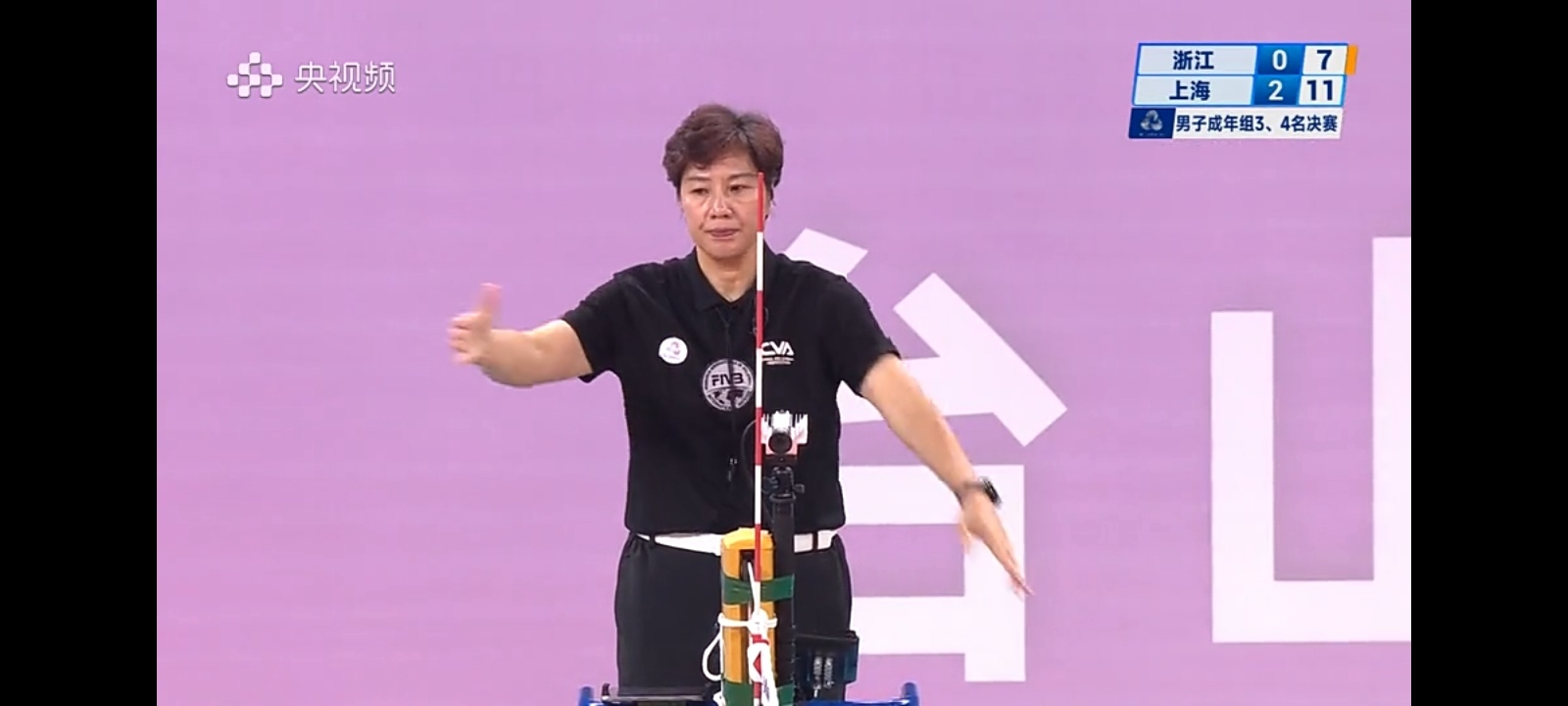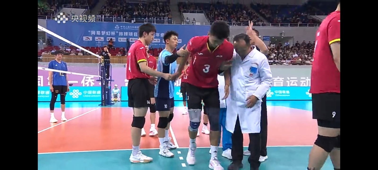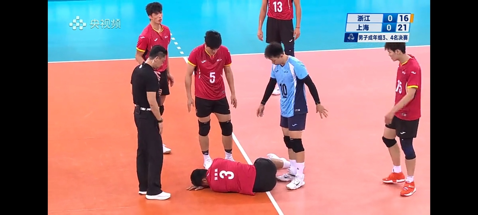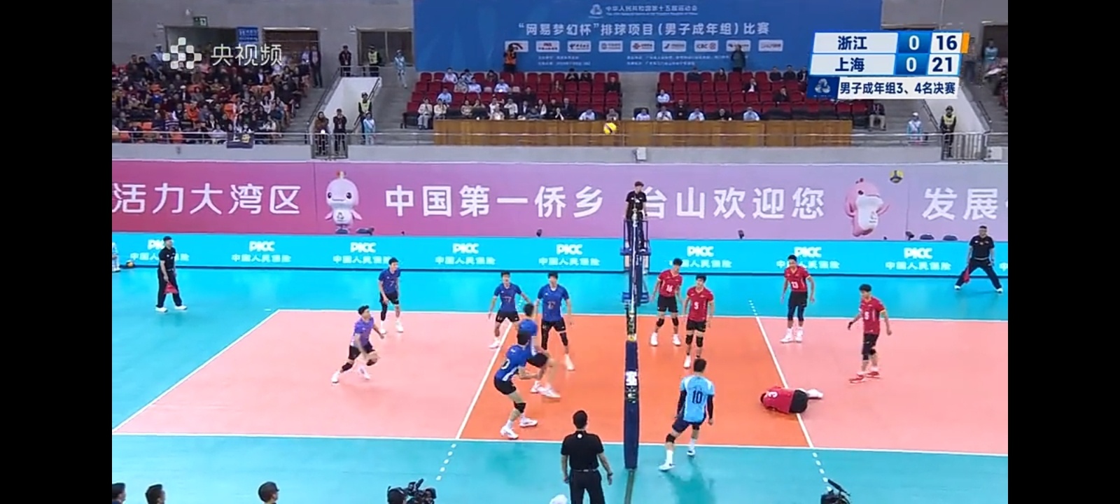 男排成年组季军赛,上海男排3比0浙江男排,今天上海开局就处于领先优势,球员打的很积极,没有受到昨天失利的影响,浙江男排在第一局中局16比21落后时,张景胤和队友相撞受伤下场,后面一直坐在场边!恭喜上海男排摘铜,也希望球员们都健康平安!