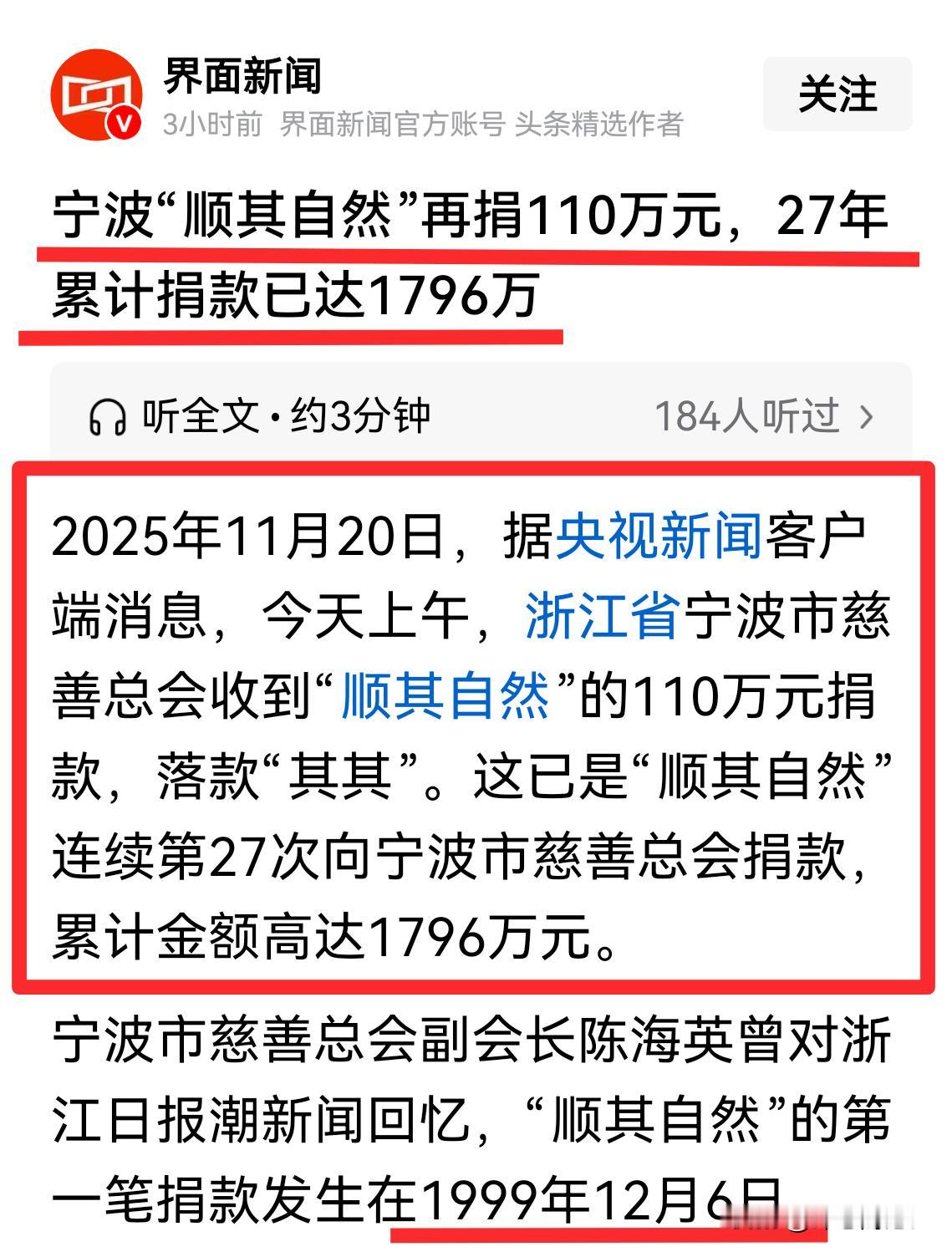 宁波|“顺其自然”27年共捐了1796万元!第一笔捐款从1999年12月开始, 猜猜做好事不留名的先生(女士)是多大年纪的人? 真心佩服这种人,不求名、不为利,隐姓埋名27年。 官方知道他是谁,也知道他为了谁,不炒作、真尊重,默默接收27年。