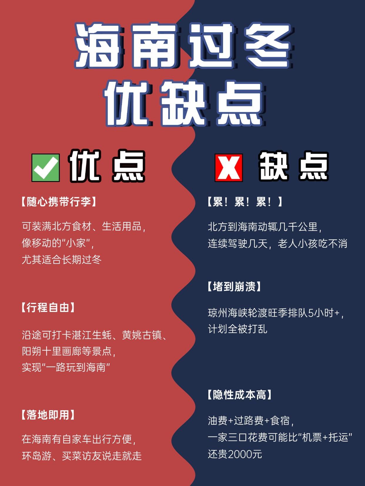 本以为海南冬天温暖如春,现实却让人大跌眼镜!北部城市如海口、文昌冬季阴冷潮湿,室内比室外还冷,睡觉离不开电热毯。南部三亚温度稍高,但物价堪比北上广,白菜10元/斤,月租轻松上万。更别提医院人满为患,回南天墙壁冒水,衣服晾不干的窘境。 真实气候:海南冬季并非全岛温暖,北部地区常遭遇湿冷“魔法攻击”,早晚温差大,体感温度甚至低于北方干冷。选择南部城市虽稍好,但成本飙升 自驾去海南的优缺点分析 优点: •随心携带行李:可装满北方食材、生活用品,像移动的“小家”,尤其适合长期过冬 •行程自由:沿途可打卡湛江生蚝、黄姚古镇、阳朔十里画廊等景点,实现“一路玩到海南” •落地即用:在海南有自家车出行方便,环岛游、买菜访友说走就走 缺点: •累!累!累!:北方到海南动辄几千公里,连续驾驶几天,老人小孩吃不消 •堵到崩溃:琼州海峡轮渡旺季排队5小时+,计划全被打乱 •隐性成本高:油费+过路费+食宿,一家三口花费可能比“机票+托运”还贵2000元 实用建议 作为带娃党,我最终放弃海南过冬!若真要出发,汽车托运是“候鸟族”最优解:既避免长途驾驶折磨,又能享受自家车的便利。 小贴士: •若坚持自驾,避开12~1月旺季,减少轮渡排队时间 •提前查天气,大雾停航可能困在港口 •身体欠佳的老人慎重,海南医疗资源紧张,慢性病开药难 结论:预算有限或怕潮湿人群,不如考虑物价仅海南零头的雷州半岛,或性价比更高的东南亚!海南过冬,真的不必盲目跟风