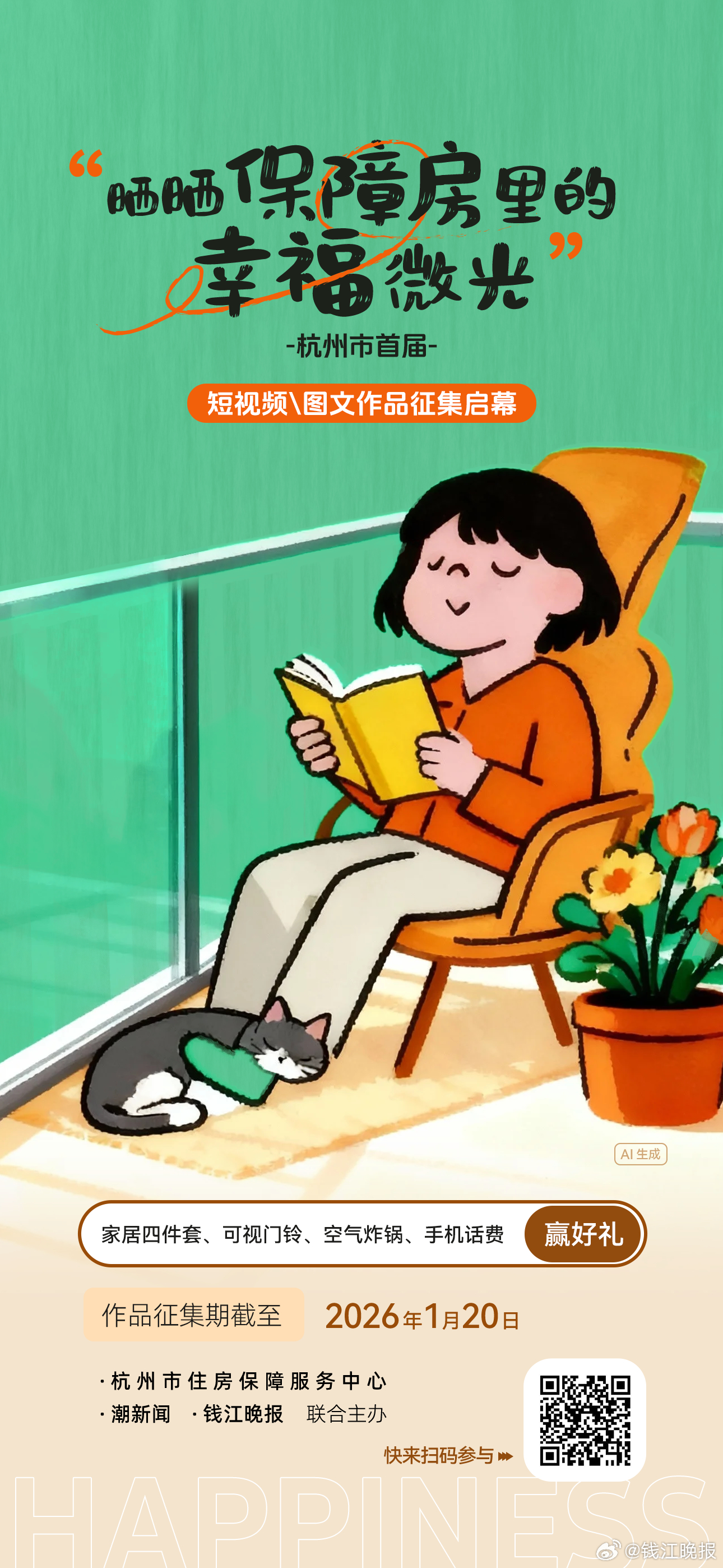 杭州市住房保障服务中心联合潮新闻·钱江晚报共同推出杭州市首届“晒晒保障房里的幸福微光”作品征集活动。从即日起,只要你参与分享你在保障房(公租房、人才专项租赁住房、青荷驿站等)的幸福瞬间,即可有机会赢取价值千元大奖。快来扫一扫下方二维码报名参加吧!