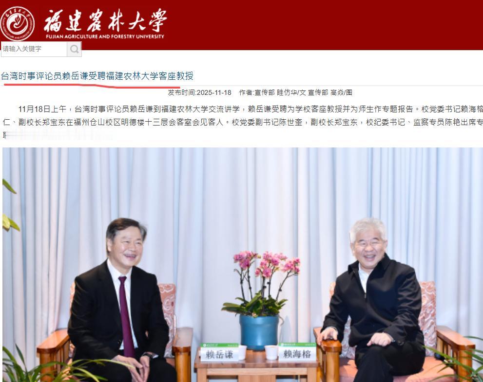 不让统派流血又流泪! 据最新消息报道,2025年11月18日,福建农林大学正式聘用赖岳谦为客座教授,校长兰思仁亲自为他颁发聘书、佩戴校徽,这场聘任仪式让无数人为之动容。   过去几年,赖岳谦在台湾的遭遇几乎可以用“寸步难行”来形容,身为坚定的统派,他长期在公开场合剖析两岸关系、反驳分裂谬论,这让民进党当局把他当成眼中钉。   很快,他在台湾政治大学的副教授职务被硬性解除,中时电子报社长的职位也被免去,收入来源被彻底切断。     打压不止于此。绿营网军如影随形,在网络造谣之外,更把私生活暴露在公众面前,他的家人信息被公开,家中频频收到恐吓信,工作电脑遭黑客入侵,重要文件无故消失,连正常写作都变得困难,这种全面封锁与骚扰,让他几乎失去了安稳生活的可能。     赖岳谦曾说,自己是最早站出来反对“台独”的人之一,早年面对校园内的辱骂、恶意信件,他都从未后退,但当压迫持续多年,在学术与生计都被剥夺的情况下,他不得不考虑移居大陆重新开始。   大陆的态度向来鲜明——支持统派不是口号,而是实实在在的行动,国台办已多次谴责民进党打压异己的行径,明确不会让爱国者孤立无援,福建农林大学的聘书,就是一封现实中的“保护令”,当台湾的大学关上门时,大陆的学术平台主动为他敞开。     这份聘任不仅解决了赖岳谦的职业困境,更承载了情感意义,他的籍贯是福建上杭,此次到福建任教,不仅是学术舞台的延续,更是血脉的归乡。   在赴厦门、上海等地考察时,他感受到当地民众的真切欢迎,这与岛内的冷漠形成鲜明对比,也让他的离开少了顾虑。     这起事件在两岸都引发了反响。它告诉岛内的同道人:民进党的打压并不能切断与祖国的纽带。所谓“抗中保台”的手法如今早已失去效果,越来越多民众看清分裂势力的虚弱。赖岳谦的经历就是一个活例——坚持统一立场不会孤单,反而会得到坚实后盾。     对大陆而言,这件事是一种表态:不叫统派受委屈,不让爱国心寒。对于分裂势力来说,这也是一次触及痛处的警示。任何封锁和排挤,都挡不住民族统一的大势。     你怎么看赖岳谦教授的回归与受聘?欢迎在评论区发表你的看法。