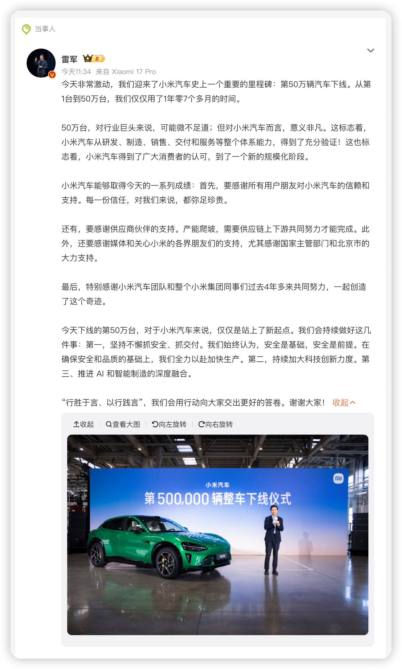 今天是小米第50万辆汽车下产线, :1. 首先,安全和交付是首要任务。雷总强调,安全和品质是根本,在这基础上会全力加快生产,让大家能早点提到车。2. 其次,要持续大力搞科技创新。他说“技术为本”是小米不变的铁律,会继续投钱研发核心技术。3. 最后,要把AI和智能制造深度结合起来。他坚信未来的汽车一定是“AI Car”,通过AI提升制造效率和产品力。总的来说,雷总就是承诺要“保安全、拼技术、搞智能”,用行动说话。