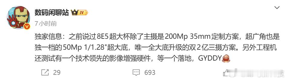 【vivo X300 Ultra影响参数曝光:双2亿像素大底三摄,支持全焦段4K视频与蔡司增距镜】博主数码闲聊站爆料,vivo X300 Ultra将采用双2亿像素大底主摄+5000万像素超大底超广角的三摄组合,构成"双2亿全大底"影像系统。新机延续与蔡司联合开发的增距镜技术,可实现2.35倍光学焦距扩展,并支持全焦段4K 60fps 10bit Log视频录制,具备14EV动态范围与709色彩监看功能,配合官方LUTs实现专业级后期调色。