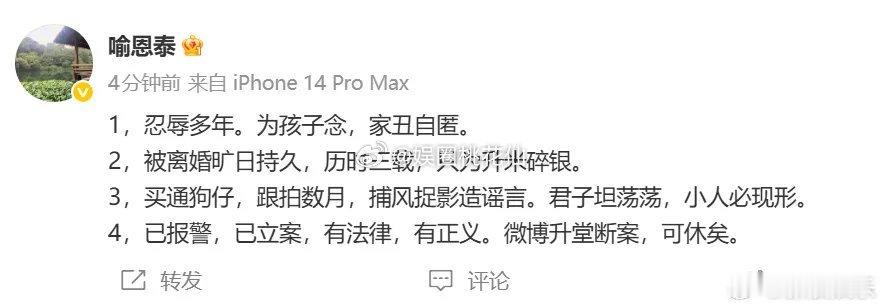 喻恩泰吕秀才的瘾还挺大,回应婚变传闻都文绉绉的,不愧是高材生啊。这段没有错别字,没有错误标点,没有多余标点,1234阿拉伯数字换行排序清晰有条理。言简意赅,逻辑清晰,重点明了,这或许就是多读书的好处吧。