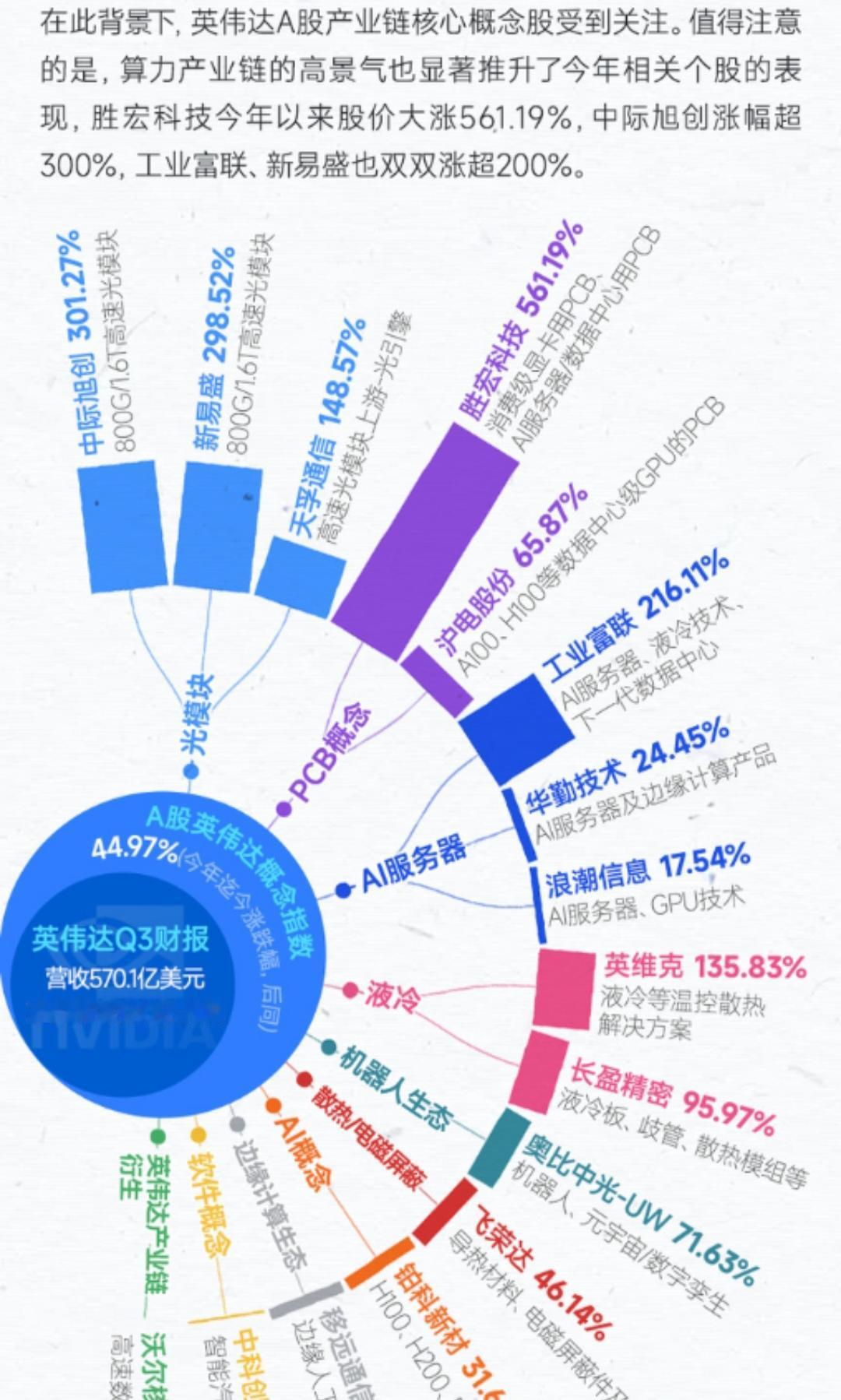 英伟达Q3营收突破570亿美元,创历史新高,其强劲表现引发市场热议。这家全球领先的GPU制造商如何影响中国科技产业? 英伟达近期公布的2026财年第三季度财报显示,该公司营收达到惊人的570亿美元,同比增长62%,环比增长22%。这一成绩不仅刷新了历史记录,也进一步巩固了其在全球科技行业的领导地位。尤其值得注意的是,数据中心业务表现尤为突出,营收达到512亿美元,同比增长66%,环比增长25%,占总收入的近90%。英伟达创始人兼CEO黄仁勋表示,其最新一代Blackwell架构芯片销量“爆表”,云服务商的GPU库存已售罄,显示出市场对其高性能计算产品的巨大需求。 从细分市场来看,英伟达的游戏业务同比增长30%,尽管环比略有下降,但得益于对Blackwell的持续需求;专业可视化业务同比增长56%,环比增长26%,主要受益于新推出的DGXSpark™及Blackwell销售的增长;汽车业务同比增长32%,环比增长1%,得益于对自动驾驶平台的持续采用。此外,数据中心计算收入创纪录达到430亿美元,同比增长56%,环比增长27%;网络收入也创下历史新高,达到82亿美元,同比增长162%,环比增长13%。 英伟达的强劲表现不仅为其自身带来了巨大的商业价值,也深刻影响着中国的科技生态圈。通过与国内多家科技巨头的合作,如阿里云、腾讯等,英伟达的产品和服务正广泛应用于云计算、人工智能等领域,为中国科技企业的技术创新提供了强有力的支持。随着AI技术的迅速普及,英伟达的影响力将进一步扩大,成为A股市场不可忽视的核心力量。