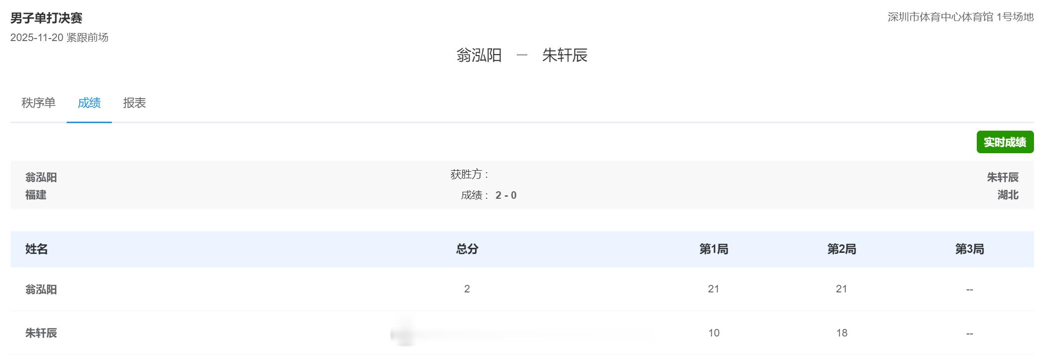 男单决赛第4场翁泓阳(福建)21-1021-18朱轩辰(湖北)恭喜小翁夺