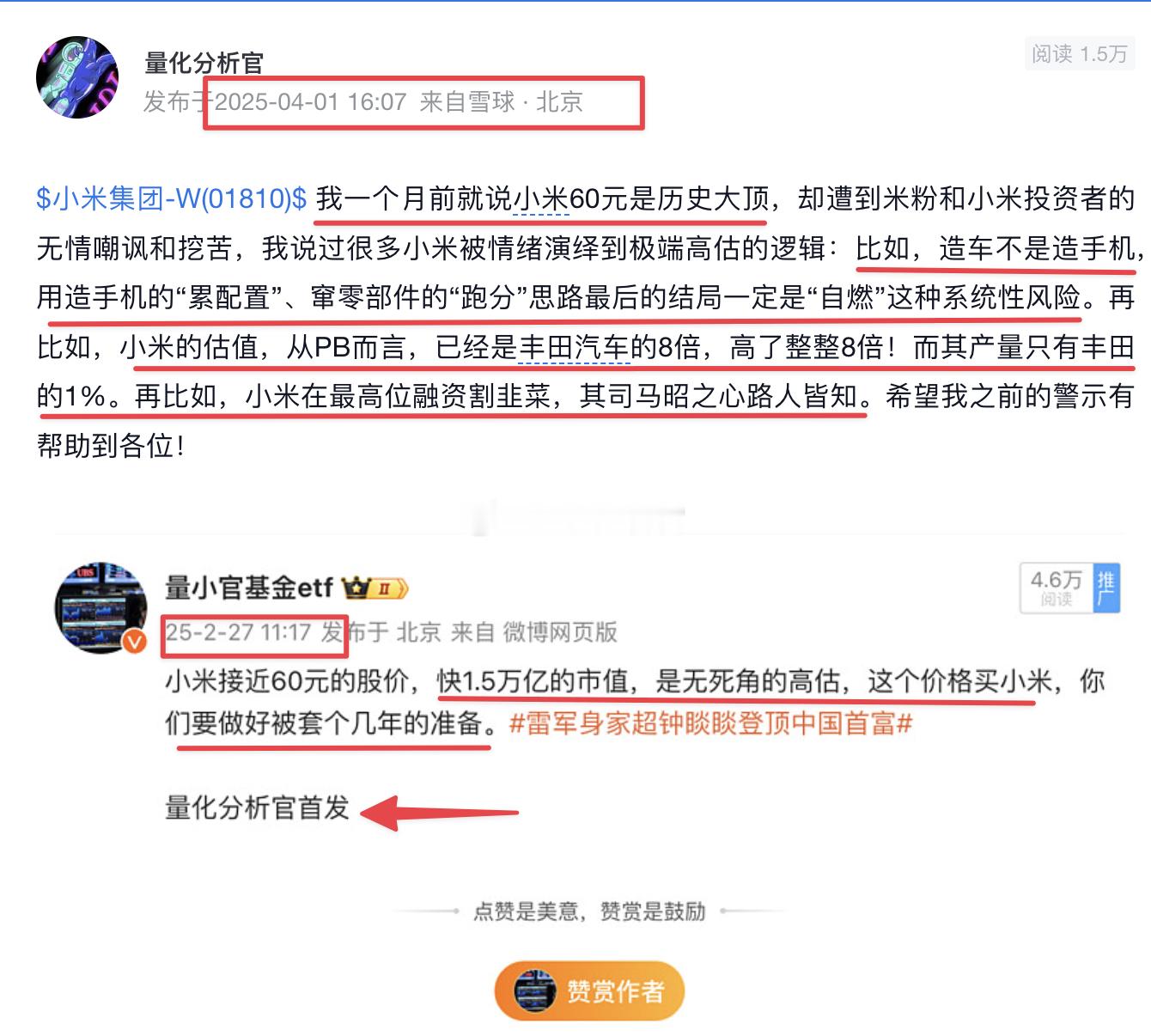 量化分析官高原,他说的一切都是对的,他说小米60是历史大顶,那就是历史大顶,只不过他由于太过超前而默默无闻
