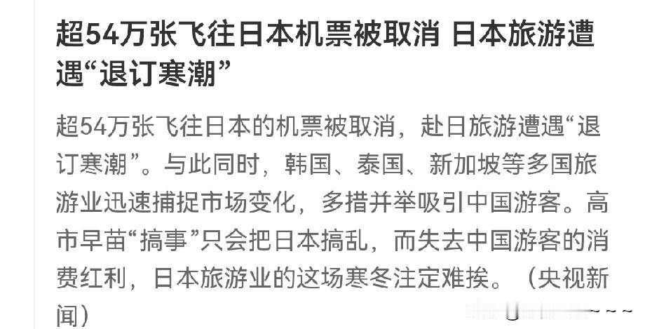 彻底完犊子了?[捂脸] 刚刚看了央视新闻,我们有这么多人去日本旅游啊!据报道:有超过54万张飞往日本的机票被取消。 仔细想想,这才几天时间呀,就50多万张,可以看到,在日本,一年算下来光旅游行业得赚我们多少钱?怪不得今天有消息人士说日本一个酒店有1000多人取消房间预定。 同时我们注意到日本旅游行业也已经开始向“搞事”的高市政府抗议了。 再这样下去,这个春节,难道日本各行各业还不黄吗?对日本来说仿佛回到了前几年的疫情时刻啊!赶紧去找说一套做一套的高市幕僚们算账去吧…