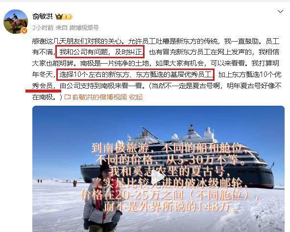 俞敏洪的南极反击:不只带员工,还要带会员去看冰川! “老板在南极看企鹅,我们在办公室‘卷绩效’,这波属实无法共情!”——这条吐槽像颗子弹,击穿了新东方成立32周年的喜庆气球。 事情的起因很浪漫:俞老板在南极写下《冰雪中的坚守》,用企鹅抱团取暖的故事鼓励员工。结局却很现实:员工们用吐槽把“企鹅文学”送上了热搜。 俞敏洪是60后企业家的典型代表。他们信奉“冰雪中的坚守”,相信奋斗能改变命运——看看董宇辉的逆袭,新东方确实有过这样的神话。 但年轻人早就换了剧本。 这届年轻人能吃苦,但绝不吃亏;愿意奋斗,但拒绝被画饼。他们见过中国经济的高速发展,受过良好教育,见过世面,懂得什么是公平。 在他们看来,“此处不留爷,自有留爷处”才是职场真理。把一生赌在一个公司?对不起,我们更相信自己的价值。 当俞敏洪在南极享受“特权自由”时,普通打工人正在为下个月房租发愁。这种对比,完美诠释了什么叫“人类的悲欢并不相通”。 面对这场吐槽风暴,俞敏洪的应对堪称教科书。 首先,他直接下场澄清:南极之旅不是网传的148万天价,实际费用20多万。 接着,他放了大招:明年冬天,要带10名基层员工和10名铁杆会员一起去南极! 最后,他重申“允许吐槽是新东方的传统”,既展现了胸怀,又暗戳戳提醒:别被冒充员工的带节奏。 对年轻人来说,判断标准很简单,什么南极不南极的不重要,共情不共情也不重要,钱到位了,飘零半生,未遇明主,你就是义父,反之,钱不到位,花里胡哨的整一堆,吃我一记圆月弯刀。