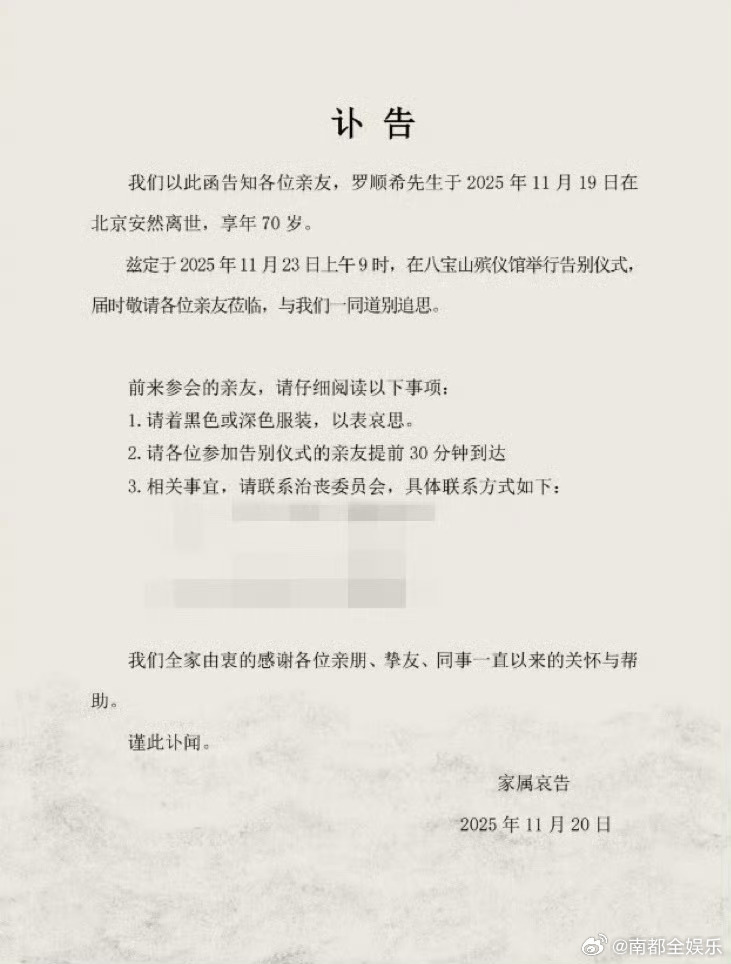 今日, 经纪人在朋友圈发讣告:“我们的好朋友罗晋先生的父亲罗顺希先生于 11 月 19 日在北京安然离世,享年70岁。罗先生本人及家人正陷于悲痛及各项事务之中,特代其发布讣告。” (北青娱见)