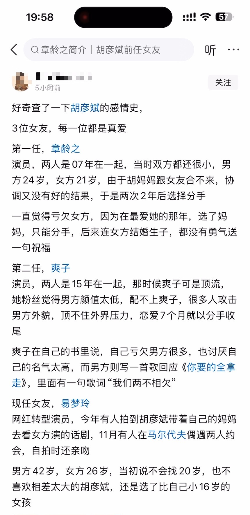 好奇查了一下胡彦斌的感情史,3位女友,每一位都是真爱