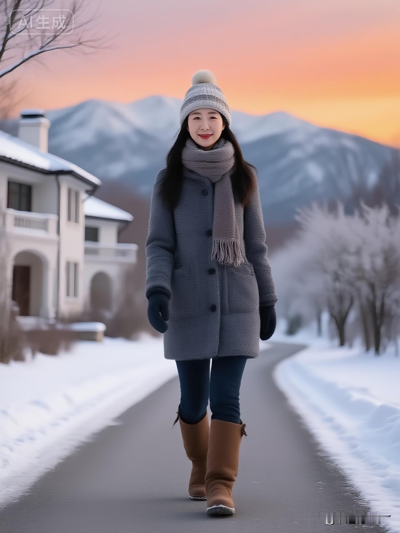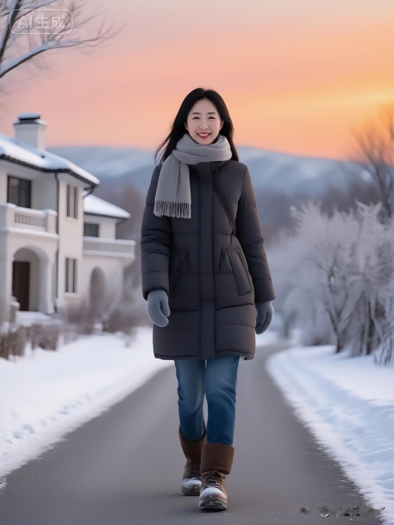 雪落了半程,黄昏就裹着橘色的雾来了。 刚吃完热乎的汤面,裹紧羽绒服的领口往门外走——路面的雪被扫到两边,露出深灰的柏油,像给冬夜铺了条温凉的缎带。风裹着碎雪扑在围巾上,却没往常的冷,大概是落日把最后一点暖都揉进了空气里。 远处的房子顶积着雪,烟囱没冒烟,却像在等晚归的人。路边的枯草挂着霜,一碰就能抖落细碎的光。走着走着,影子被夕阳拉得很长,连脚步声都轻软下来——原来冬天的温柔,藏在饭后散步的每一步里,是围巾上的绒球沾了雪,是靴子踩过路面时,落日刚好吻在发稍。