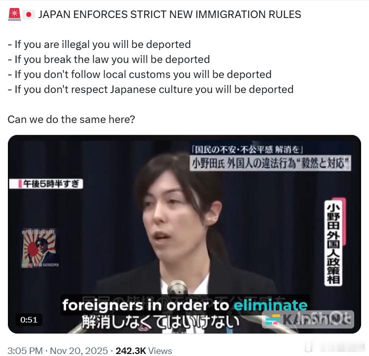 日本将实施严格的新移民规定:- 如果你是非法移民,就会被遣返 - 如果你违法,就会被遣返 - 如果你不遵守当地风俗,就会被遣返 - 如果你不尊重日本文化,就会被遣返 美国欧洲是不是都应该这么干?