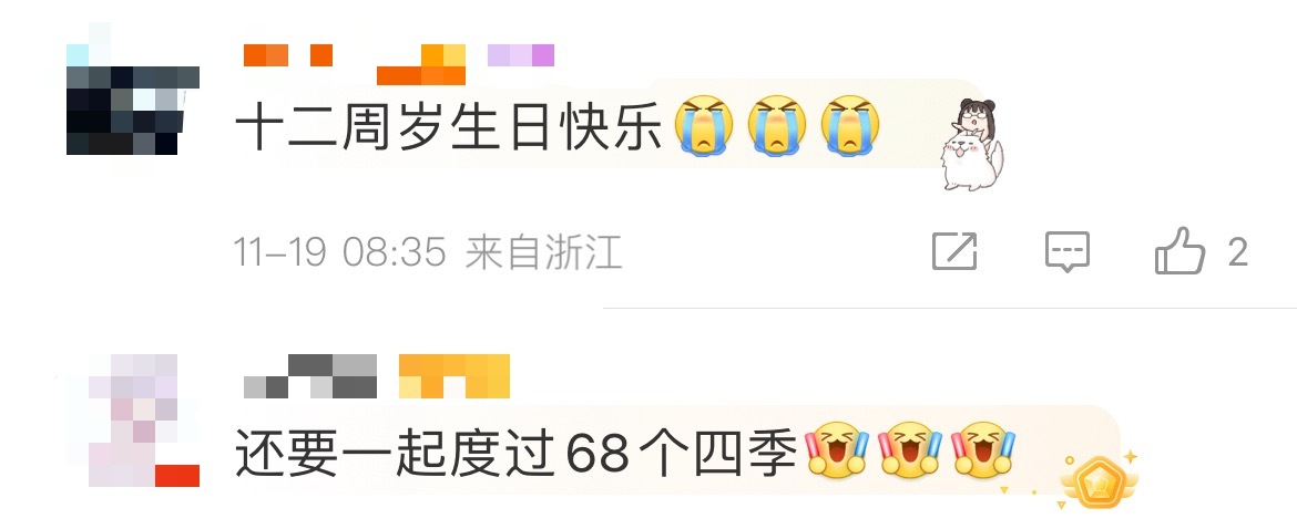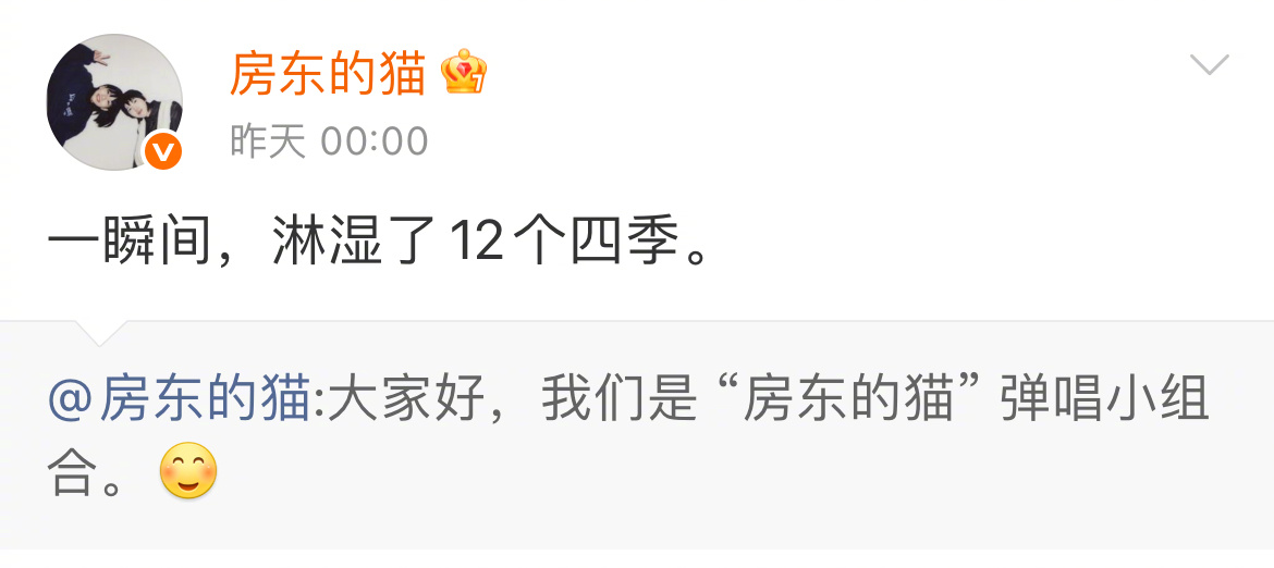 谁允许房猫用callback来催泪的竟然在12周年这天把12年前的第一条微博捞出来了,“一瞬间,淋湿了12个四季”这句更是在放大招,就问是不是眼泪流下了所以淋湿了!看到评论区整整齐齐的祝福更是恍惚,怎么这么快就12年了,我们弹唱小组合请大胆往前走,继续陪大家走过更多四季好吗!