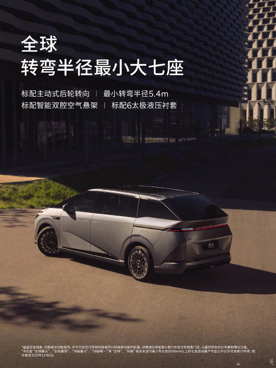 小鹏X9带着鲲鹏超级增程技术,强势开启增程新时代,一举解决了传统增程的诸多痛点。在续航方面,小鹏X9超级增程表现卓越。它拥有452公里的纯电续航,对于日常城市通勤来说,完全可以做到一周一充电,让用户告别频繁充电的麻烦。而且,一年下来能节省好几万油费,经济实惠十分可观。其1602公里的综合续航,更是让小鹏X9超级增程成为全球续航最长的大七座车型。加满油、充满电后,从北京开到上海都不用中途补能,无论是日常长途出行,还是自驾游,都能让用户省心又省钱。补能速度上,小鹏X9超级增程也不逊色。它配备的63.3度超快充磷酸铁锂大电池,仅需10分钟就能充电306公里。就像吃顿饭的功夫,车辆就能满电复活,补能速度比很多纯电车还要快,让用户彻底告别排队充电的煎熬。并且,它不挑桩、不挑油,不管是城市里的充电桩,还是高速服务区的加油设施,都能轻松实现补能。对于一台承载全家人的大七座车来说,安全至关重要。小鹏X9超级增程同时满足中国和欧洲的最高等级安全标准。它拥有同级最大的8892立方厘米前端吸能盒,全车标配同级最多的9个安全气囊,为车内乘客提供全方位的安全保障。在主动安全方面,小鹏X9超级增程表现惊人,即便遇到极限全场景爆胎的情况,车辆也不会失控。当面对高速施工、抛锚车等危险状况时,它能实现130km/h的AEB紧急制动,以及130km/h的AES紧急避让。此外,首发的冰雪稳行功能,让车辆在冰雪天行驶时,不会出现甩尾、跑偏、失控等情况,大大提升了冬季行车的安全性。在空间表现上,小鹏X9超级增程带来了令人惊喜的电动三折叠设计。第三排支持四六比例电动折叠和纯平收纳,能形成2514L的同级最大纯平储物空间。用户只需一键操作,就能灵活切换出四人露营、五人骑行、六人携宠、七口之家等多种空间布局,满足不同的使用场景需求。全球最长续航、超快充、全方位安全保障以及百变空间,小鹏X9超级增程这一系列出色的表现真的让人眼前一亮。目前,小鹏X9超级增程上市发布会正在直播,一起来见证小鹏X9如何玩转“下一代增程”。