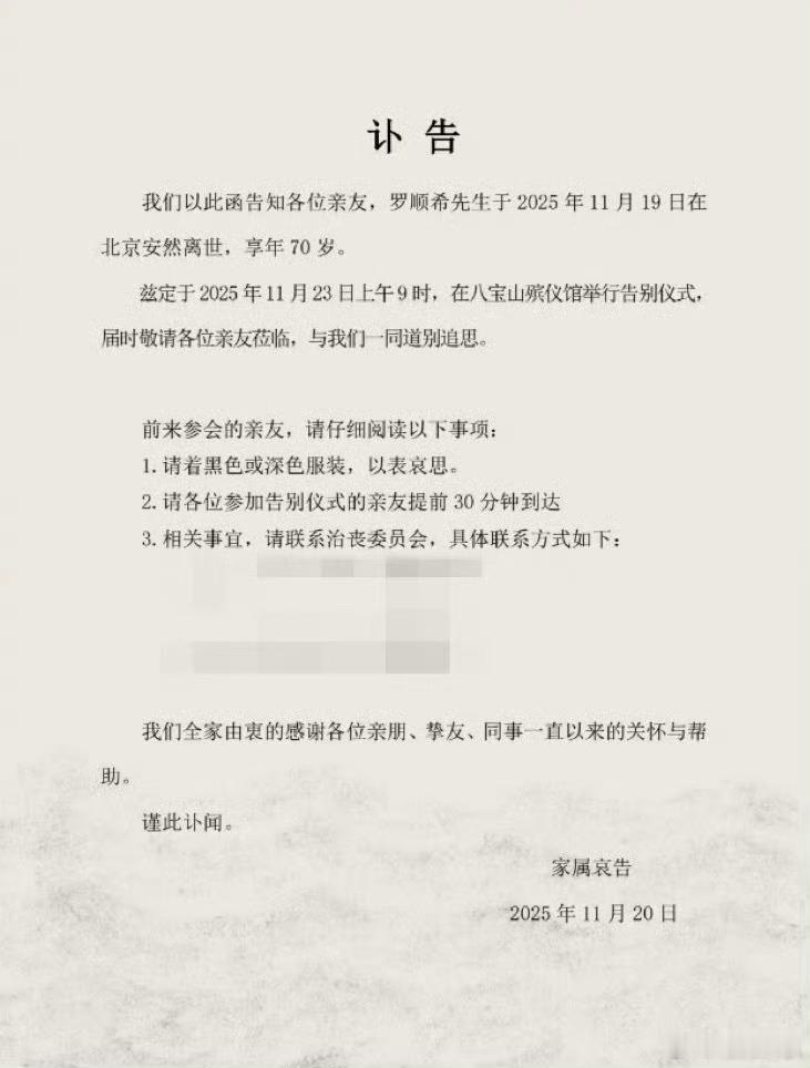 据报道,11月20日, 经纪人在朋友圈发讣告:“我们的好朋友罗晋先生的父亲罗顺希先生于 11 月 19 日在北京安然离世,享年70岁。罗先生本人及家人正陷于悲痛及各项事务之中,特代其发布讣告。”