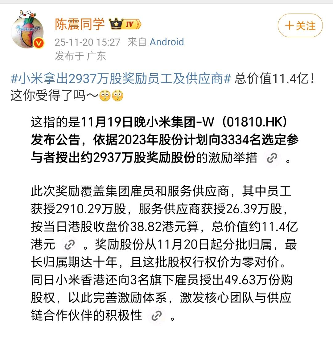 陈震:小米拿出2937万股奖励员工及供应商 总价值11.4亿!这你受得了吗~[狗头][狗头] 哇塞,这真的是非常多的股份激励呀一共向3334名选定参与者授出该股份奖励,总价值11.4亿。 不过最近小米的股票却是跌跌不休,也不知道到明天的时候小米的股价能不能触底反弹,关键是投资者也不知道什么时候是个底。 各位是怎么看的?欢迎评论区留言。