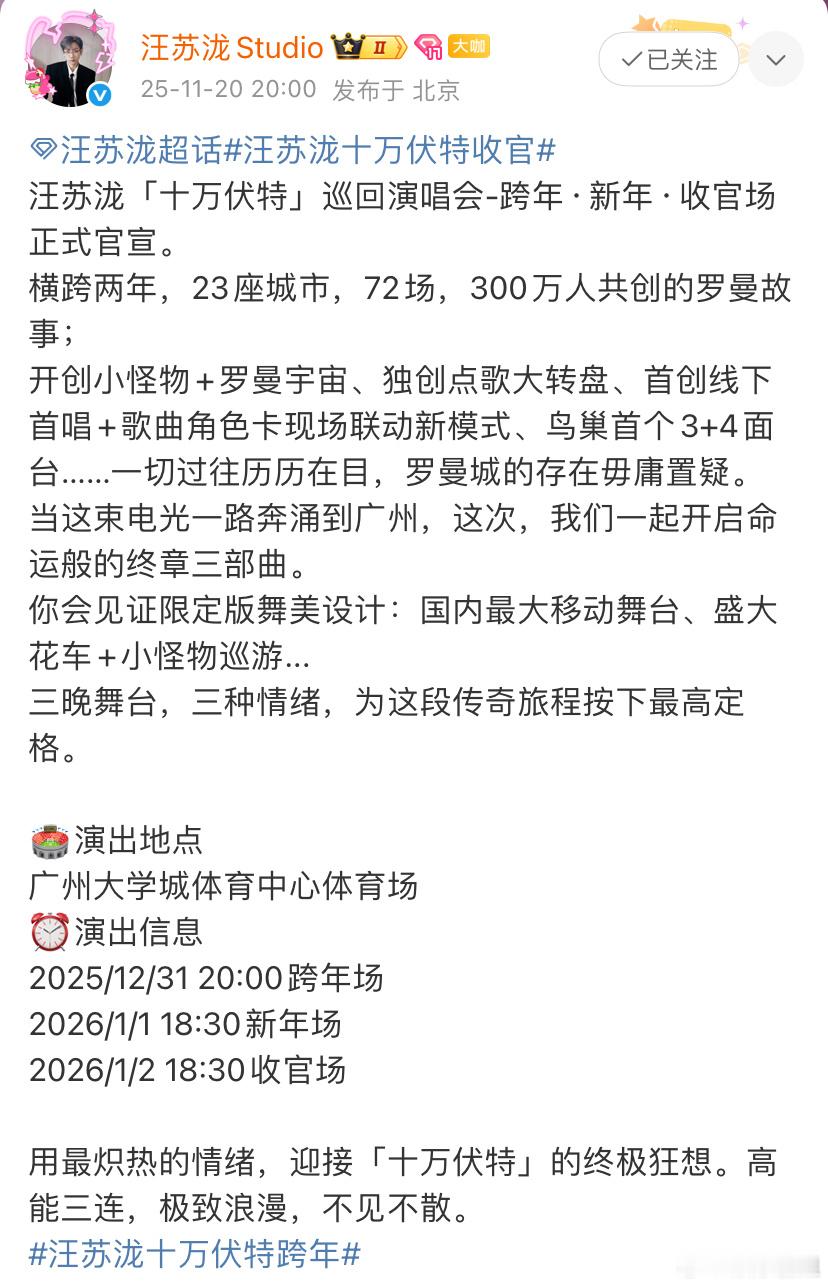 汪苏泷官宣跨年场新年场收官场,属于十万伏特的终极三部曲!汪苏泷邀你一起见证前所未有的三连体育场狂欢