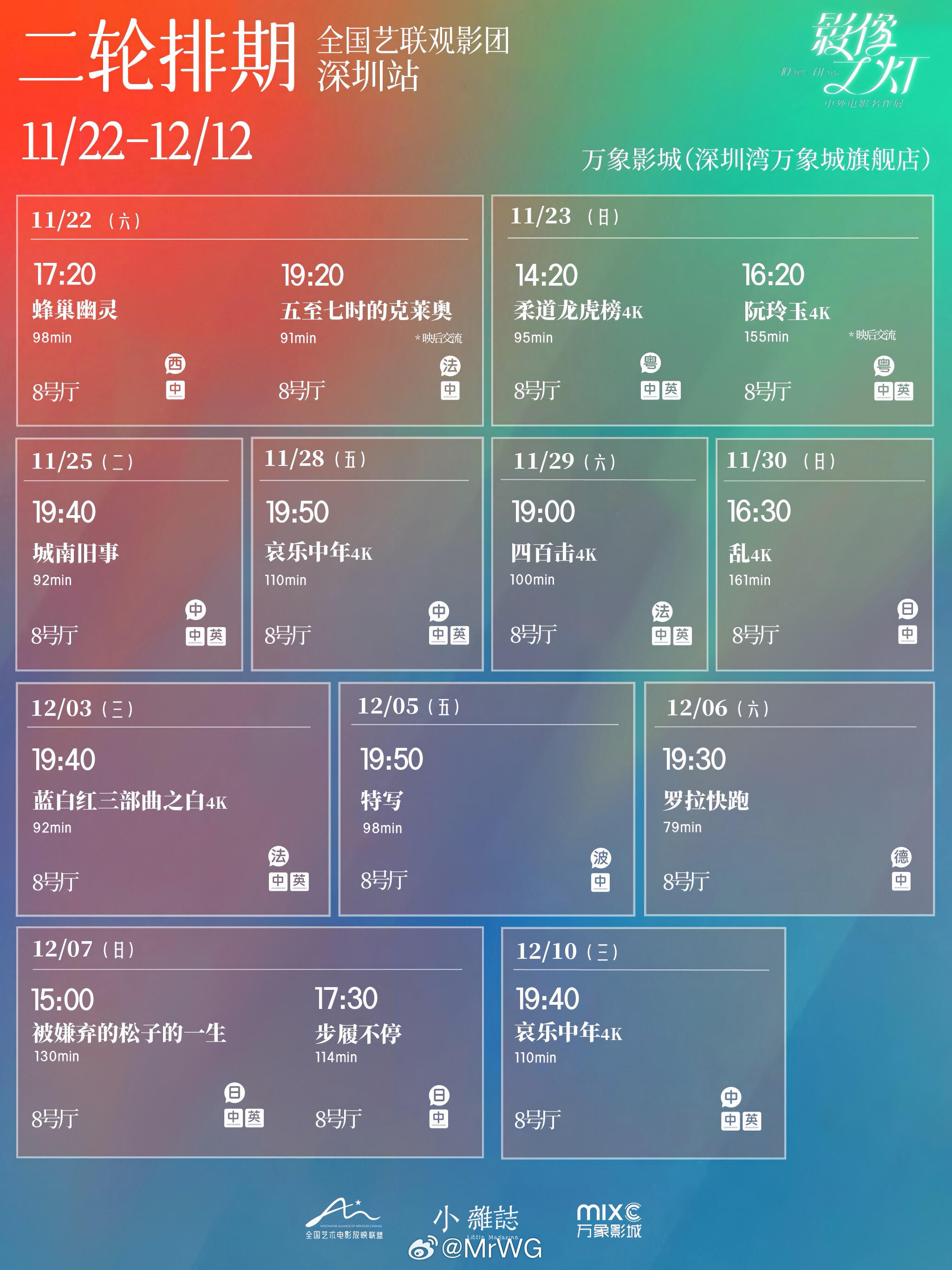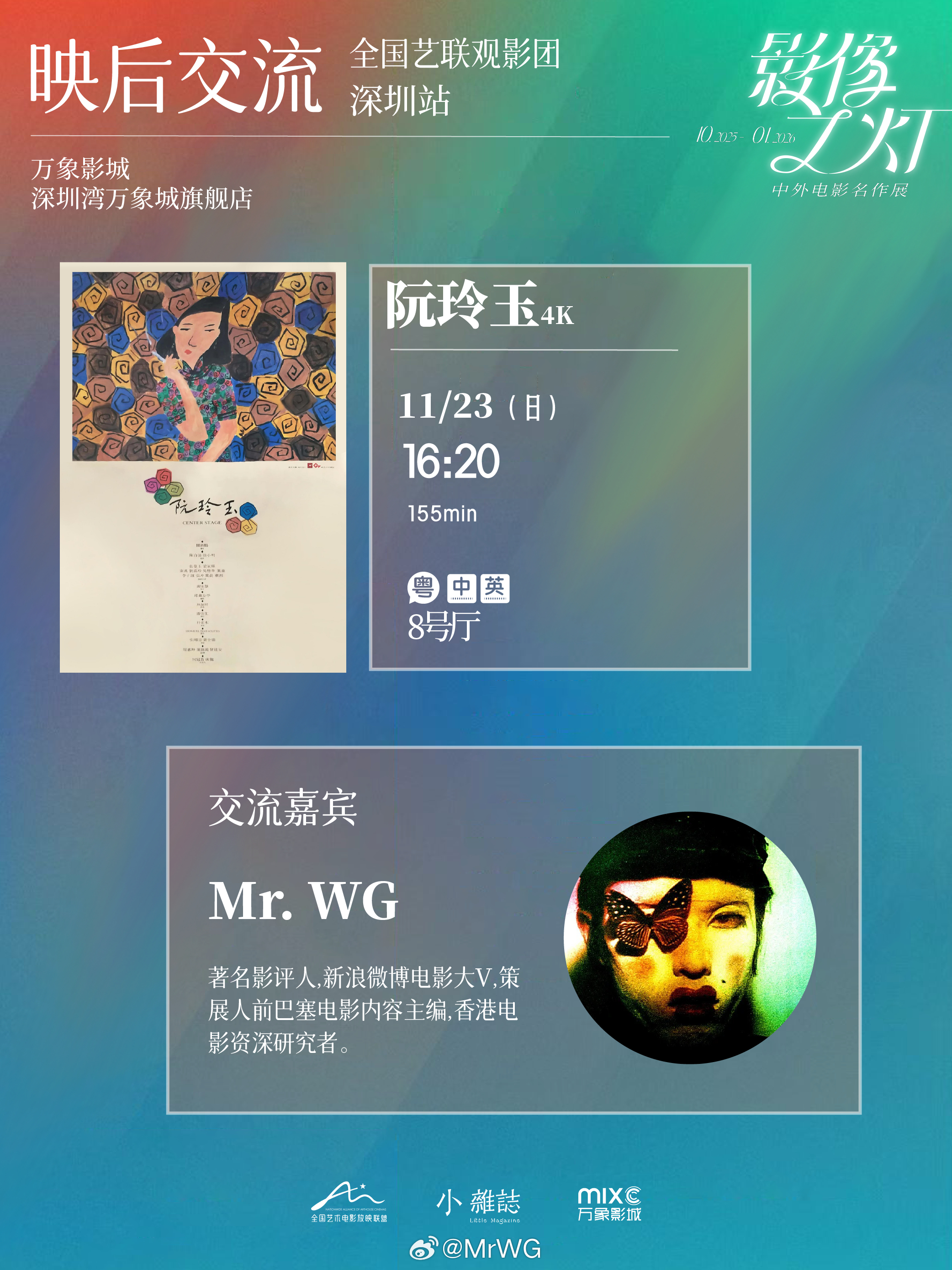 谢谢艺联邀请!2025全国艺联“影像之灯·中外电影名作展”,深圳站二轮巡展·张曼玉 夺得柏林影后之作【阮玲玉】4K修复版(11/23,本周日)——我会担任映后嘉宾,从邱刚健编剧的“跨时空”、伪纪录文本,张曼玉的表演,幕后花絮,连麦全面解析影片。 到场影迷可获得周边(【阮玲玉】海报+纪念票根)+盖本片印章,大湾区的影迷别错过~