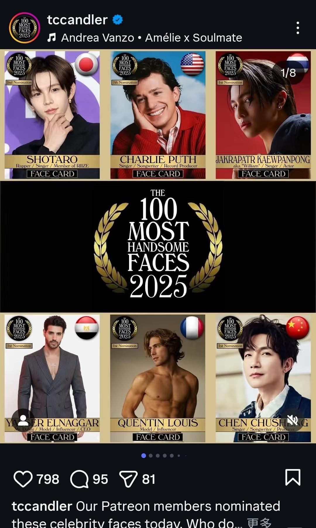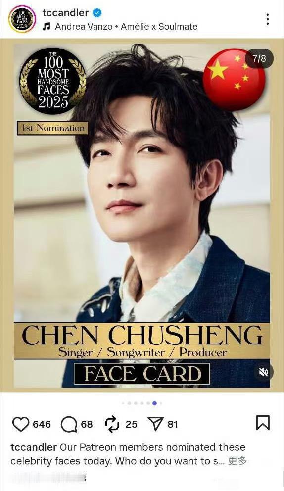 陈楚生新赛道—-百名英俊面孔提名。 咱生哥竟然开始竞选百名最帅面孔了,人物介绍他是歌手、词曲作者和音乐制作人。