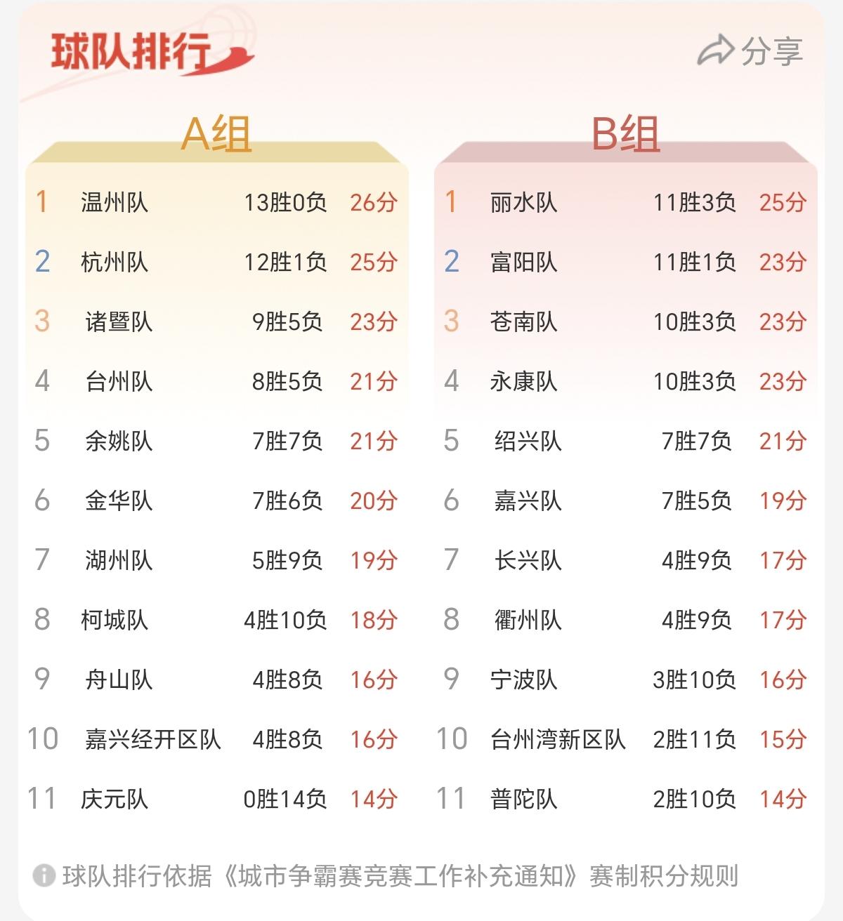 从目前的积分排名来看,明天台州队的比赛,还是处在一个比较重要的节点的。如果明天比赛获胜,还能够继续排在a组小组赛前4名。如果明天输了比赛,后续金华队和余姚队获胜的话,台州队可能会掉出前4名。所以,能否巩固前4名,明天晚上的比赛,对台州队来说,也是挺重要的。至于诸暨队,随着今晚比赛的获胜,暂时稳定在a组前4名。