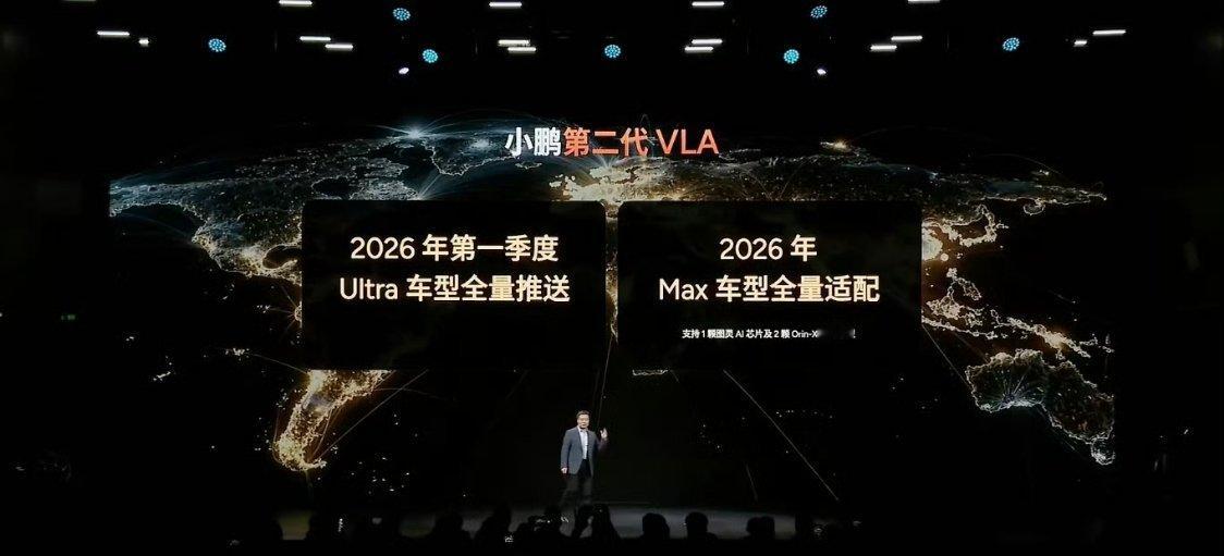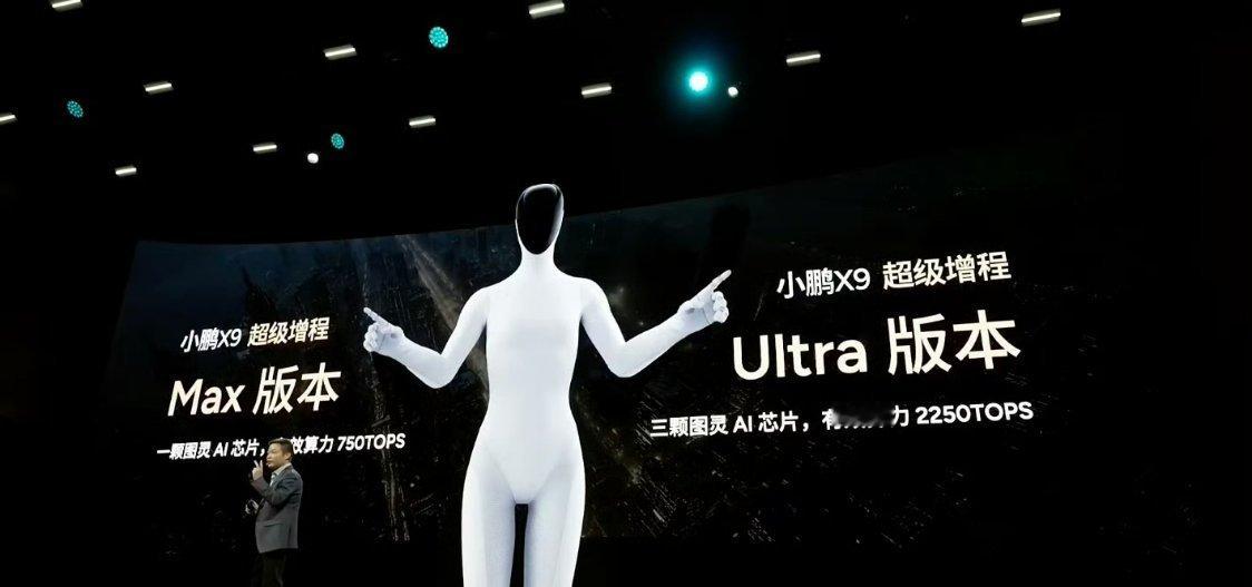 小鹏 X9 Max 版和 Ultra 版的不同在于图灵 AI 芯片的数量,Max 一颗,有效算力 750 TOPS,Ultra 版三颗,有效算力 2250 TOPS。X9 搭载了物理世界大模型第二代 VLA,2026 年第一季度 Ultra 车型全量推送,2026 年 Max 车型全量适配。